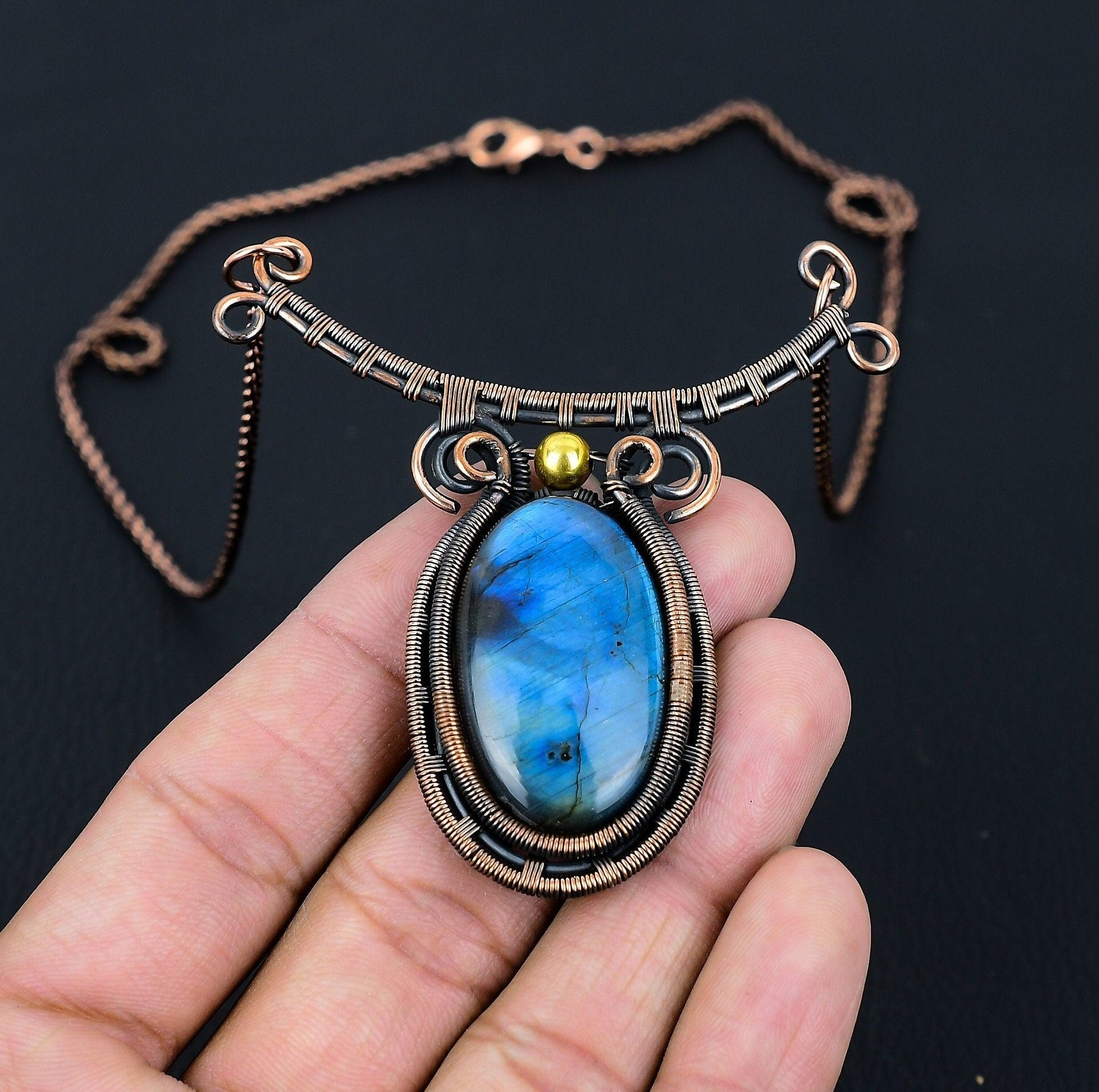 Introducing our exquisite handcrafted necklace, featuring a stunning blue gemstone set against an intricately designed copper wire frame. This unique statement piece beautifully combines elegance with a touch of bohemian flair.