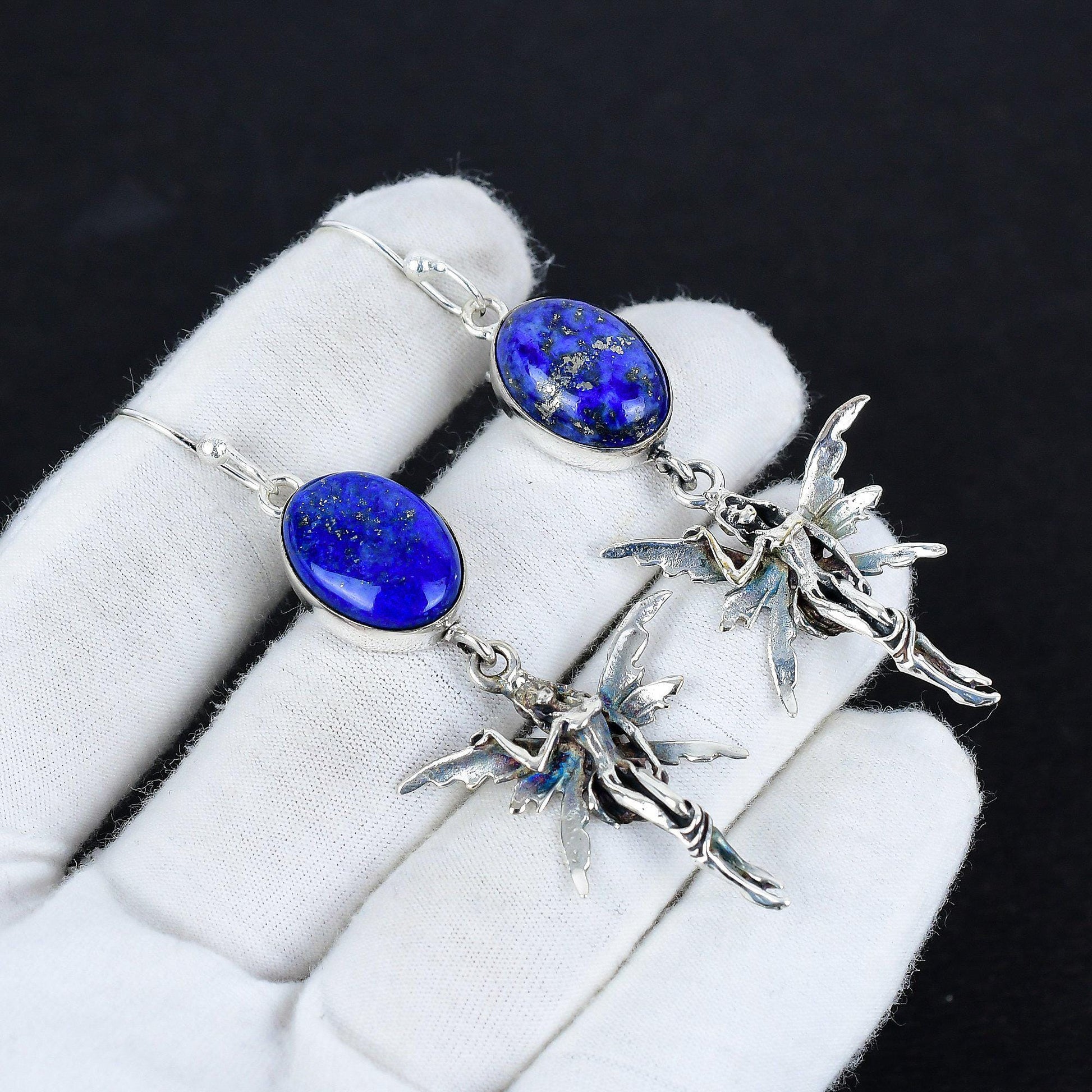 Design: These exquisite earrings feature intricately crafted fairy figures, gracefully paired with vivid lapis lazuli gemstones that glow with deep blue hues and mesmerizing specks of gold.