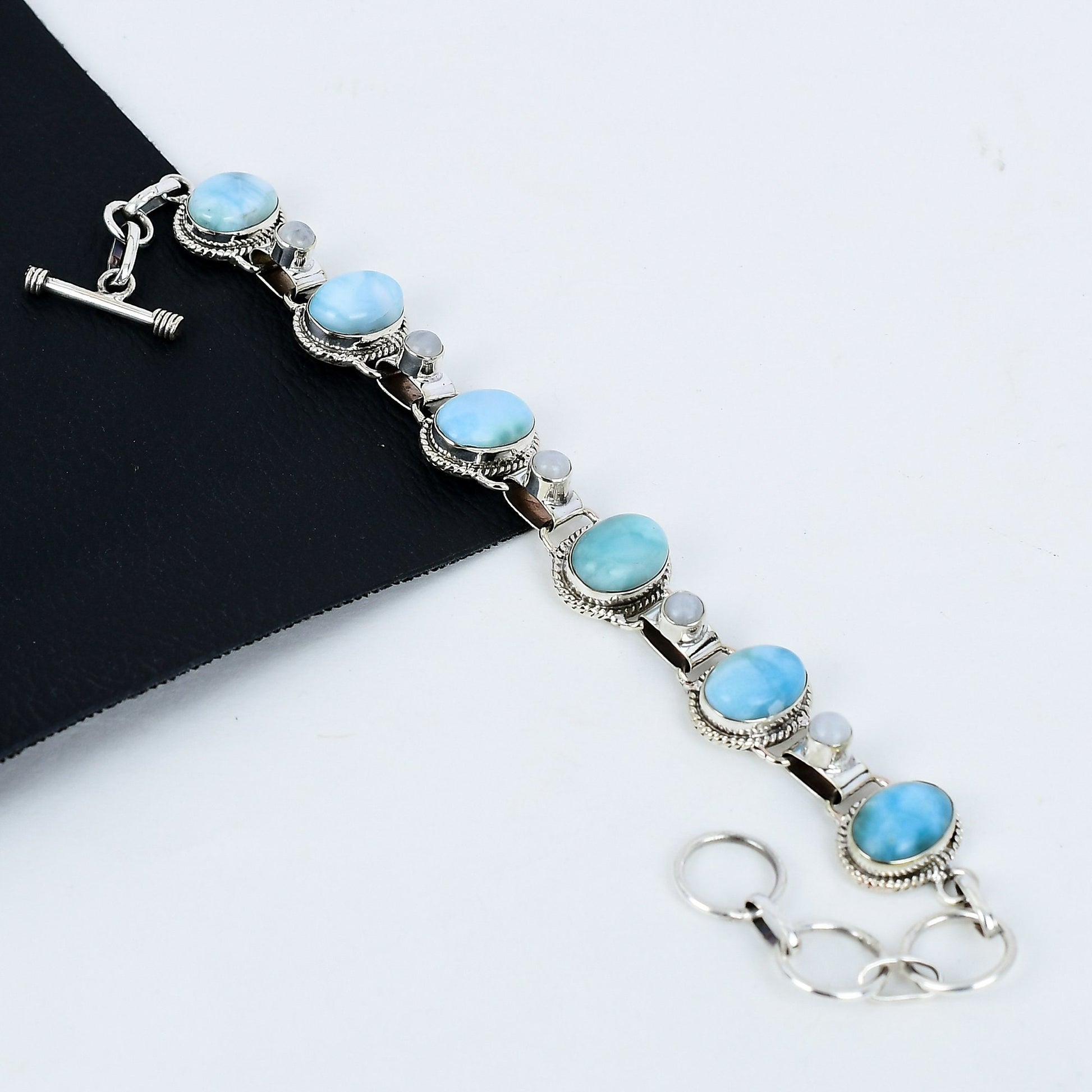 Elevate your elegance with this exquisite Larimar and Moonstone bracelet.