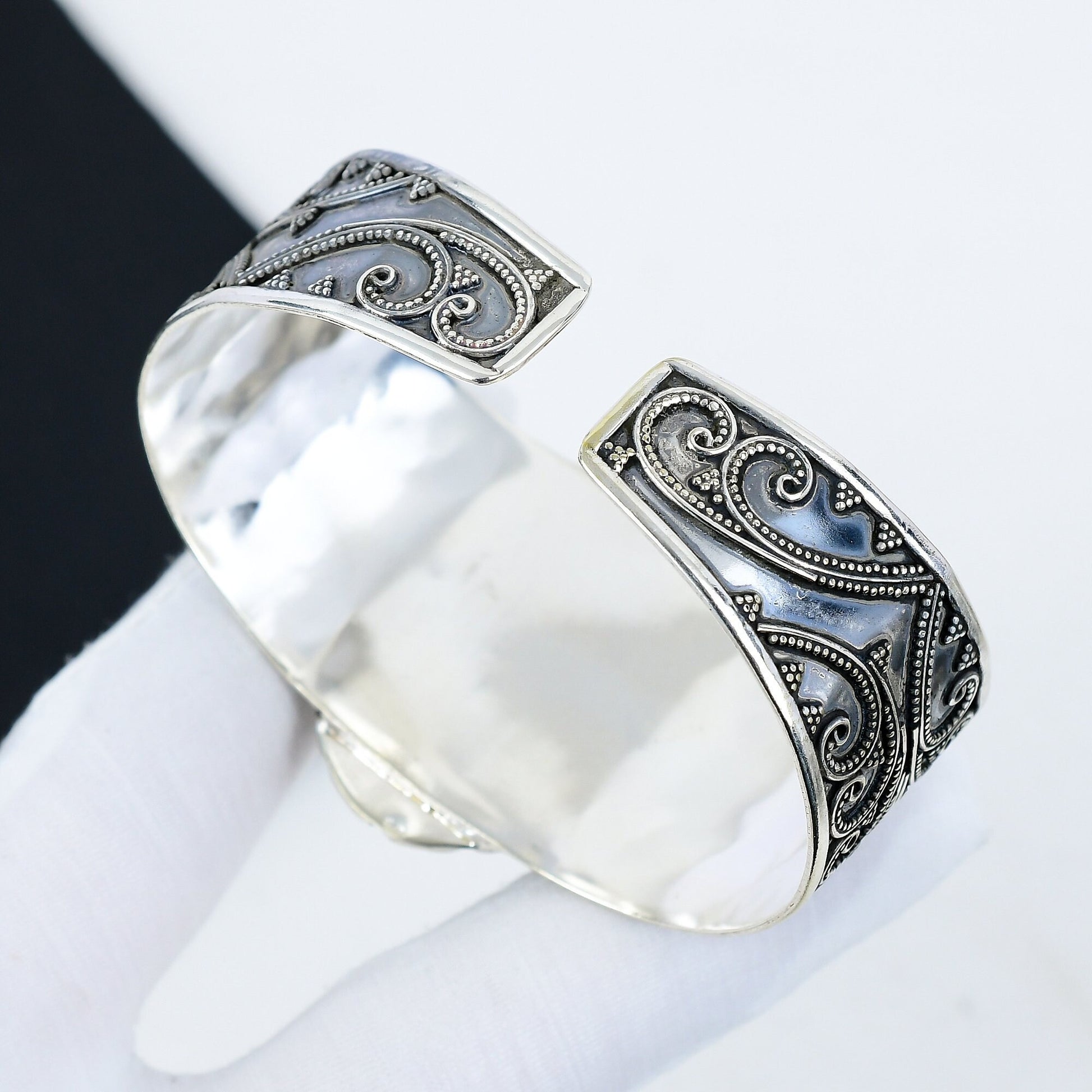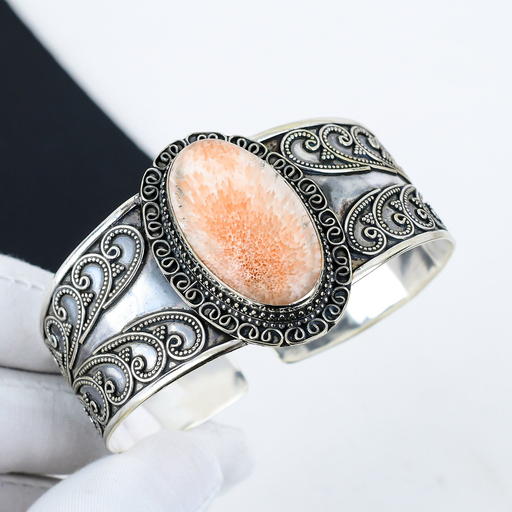 Elevate your style with this exquisite handcrafted cuff bracelet, featuring a stunning oval centerpiece of soft peach-hued stone. The intricate, swirling silver patterns on the band bring an elegant touch, creating a perfect blend of modern sophistication and timeless charm.