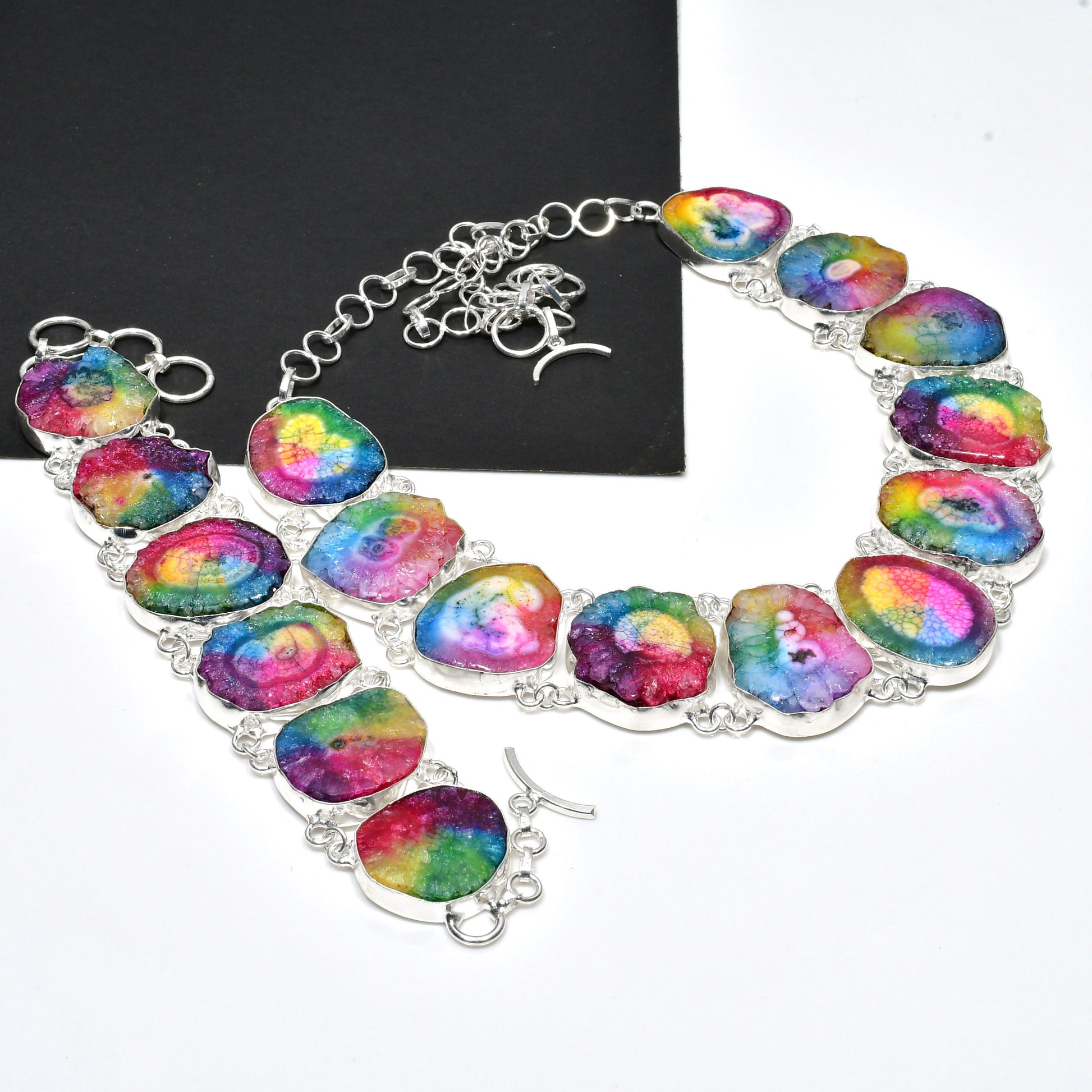 Enhance your style with this stunning multicolor gemstone necklace and bracelet set, designed to captivate and inspire.