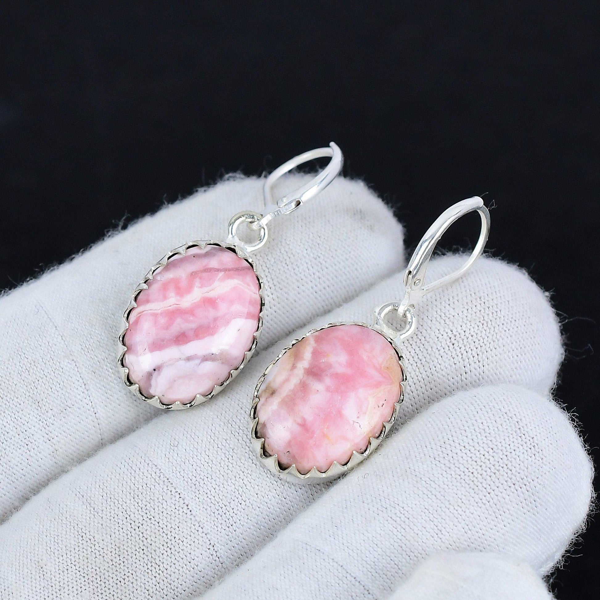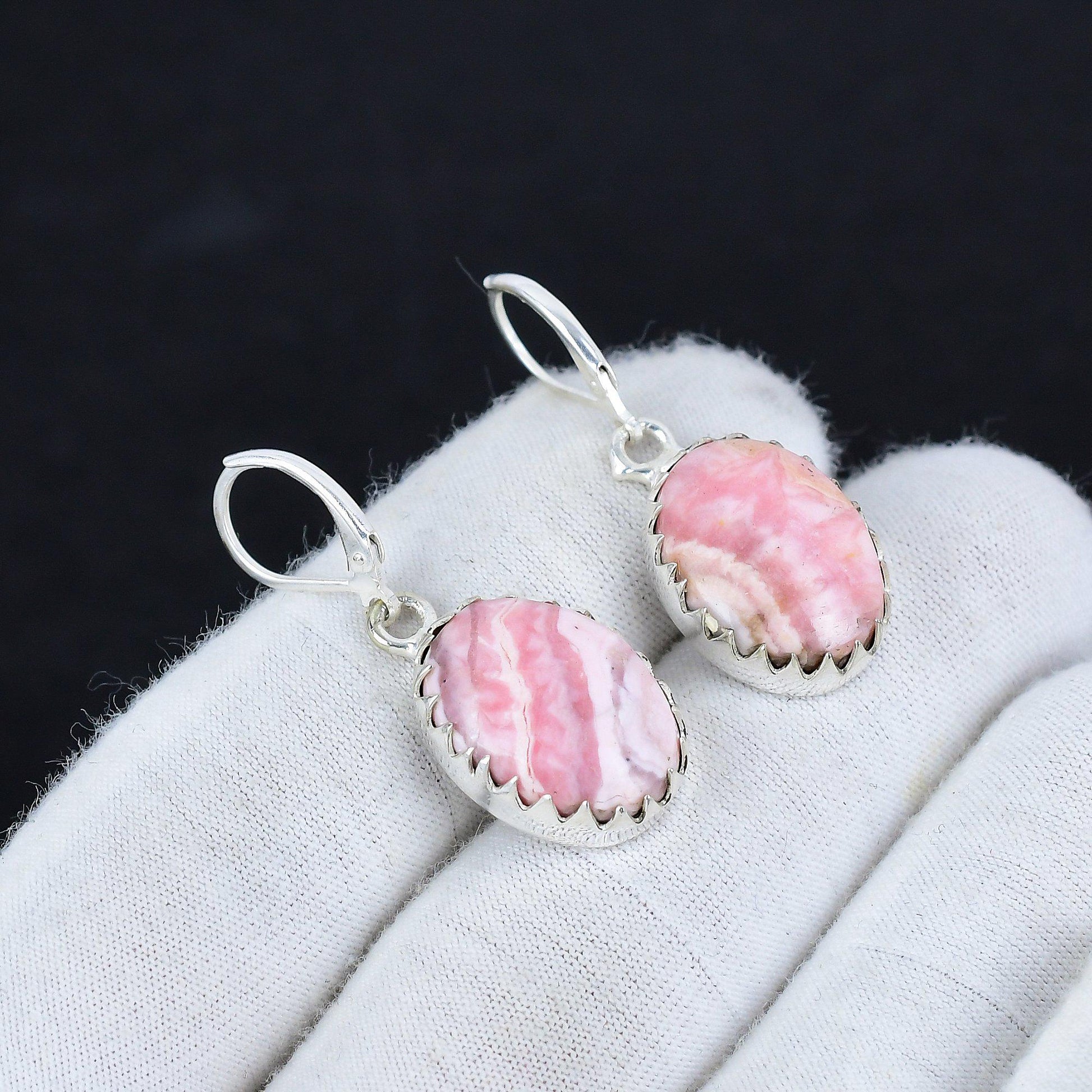 Each earring showcases a beautifully crafted pink cabochon, delicately set in a silver-tone frame. The gentle curves and natural patterns of the stones provide a unique and eye-catching allure, perfect for any occasion.