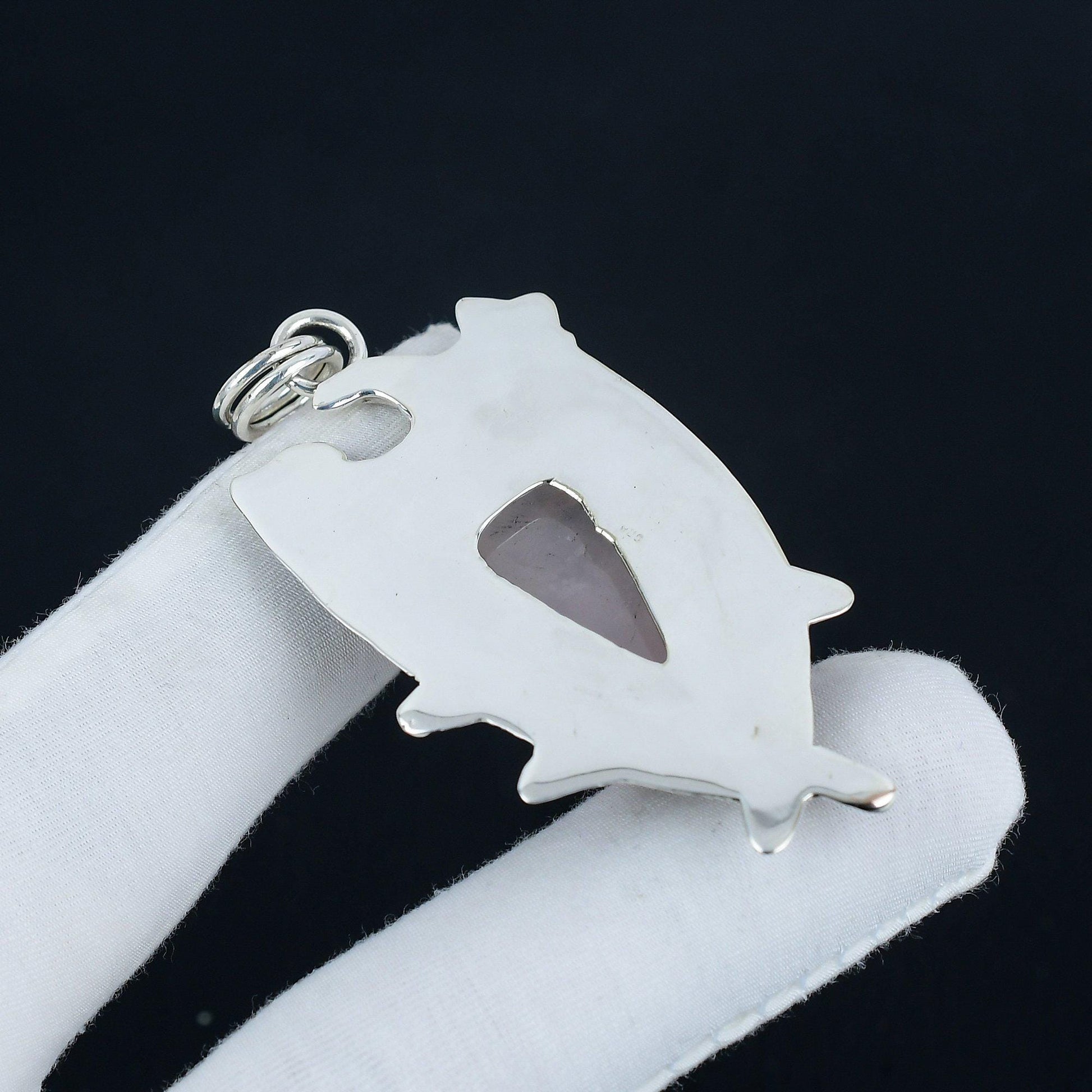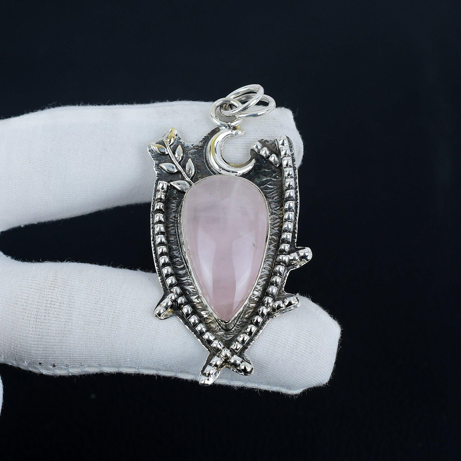 This beautiful pendant features a stunning teardrop-shaped rose quartz gemstone, encased in a detailed sterling silver setting. The unique design is accentuated by delicate leaf and vine embellishments, adding a touch of nature-inspired beauty.