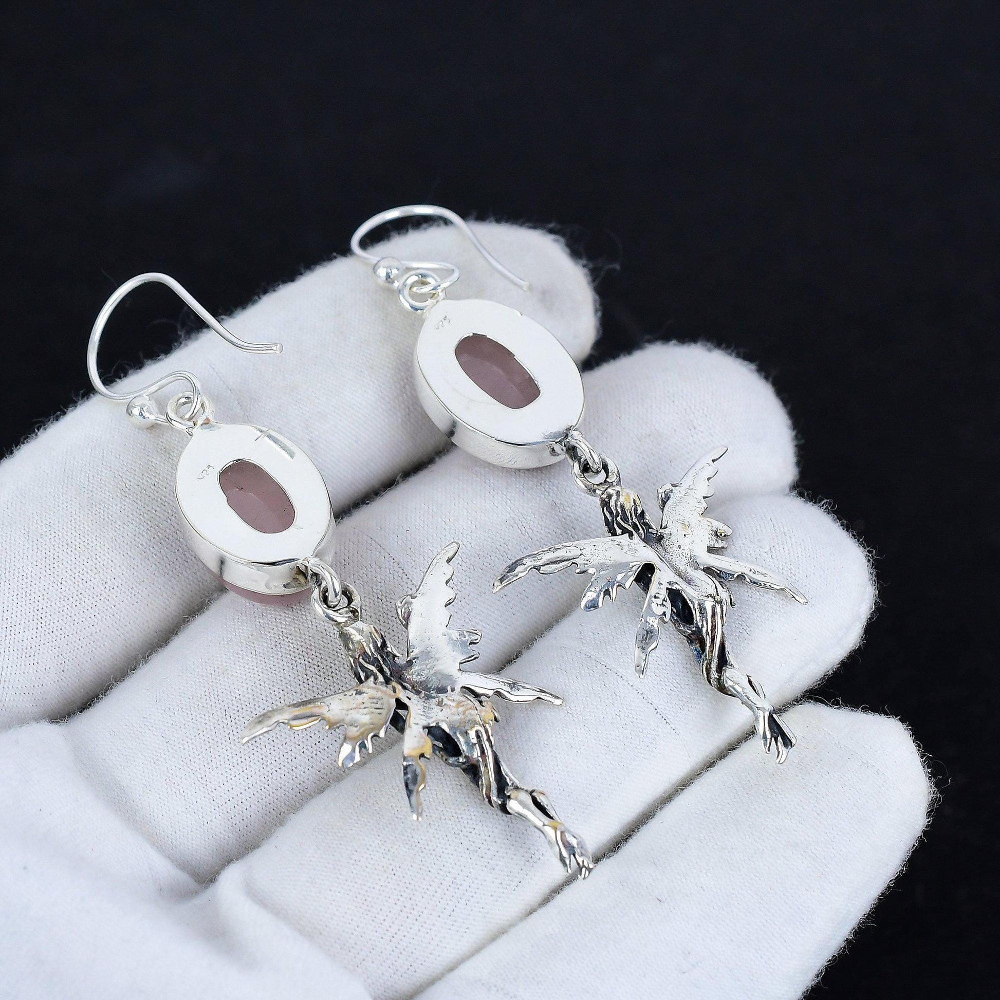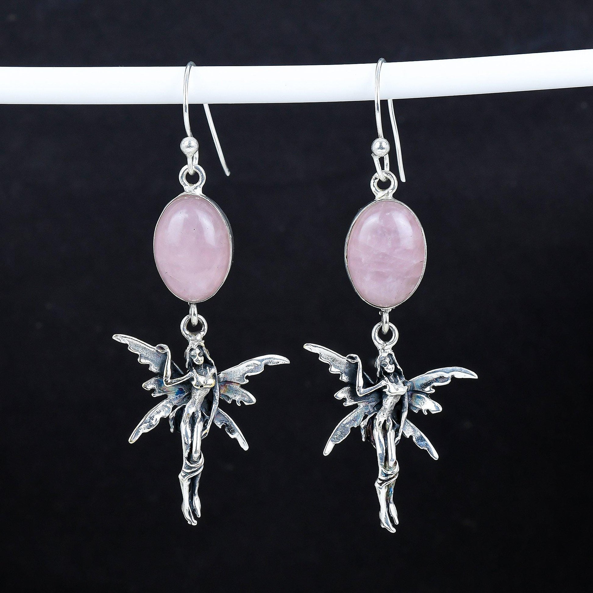 Crafted with the finest silver, these earrings feature enchanting fairy figures that delicately dangle from luminous, oval rose quartz stones.