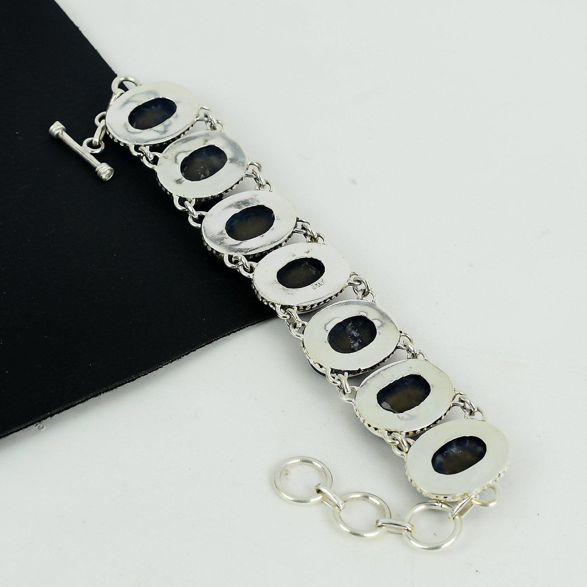 Discover elegance with our exquisite bracelet, featuring stunning deep blue stones delicately crafted with intricate silver accents.