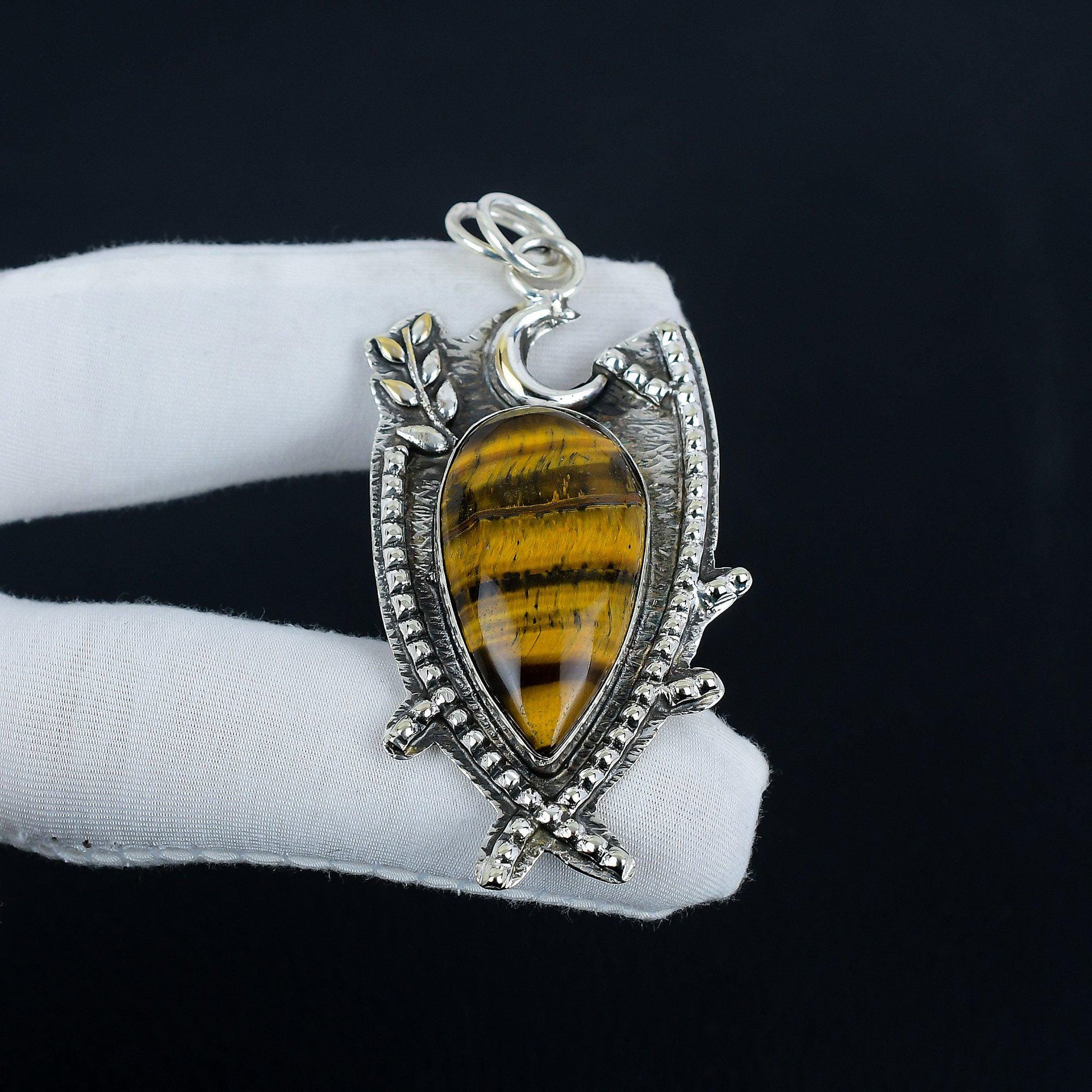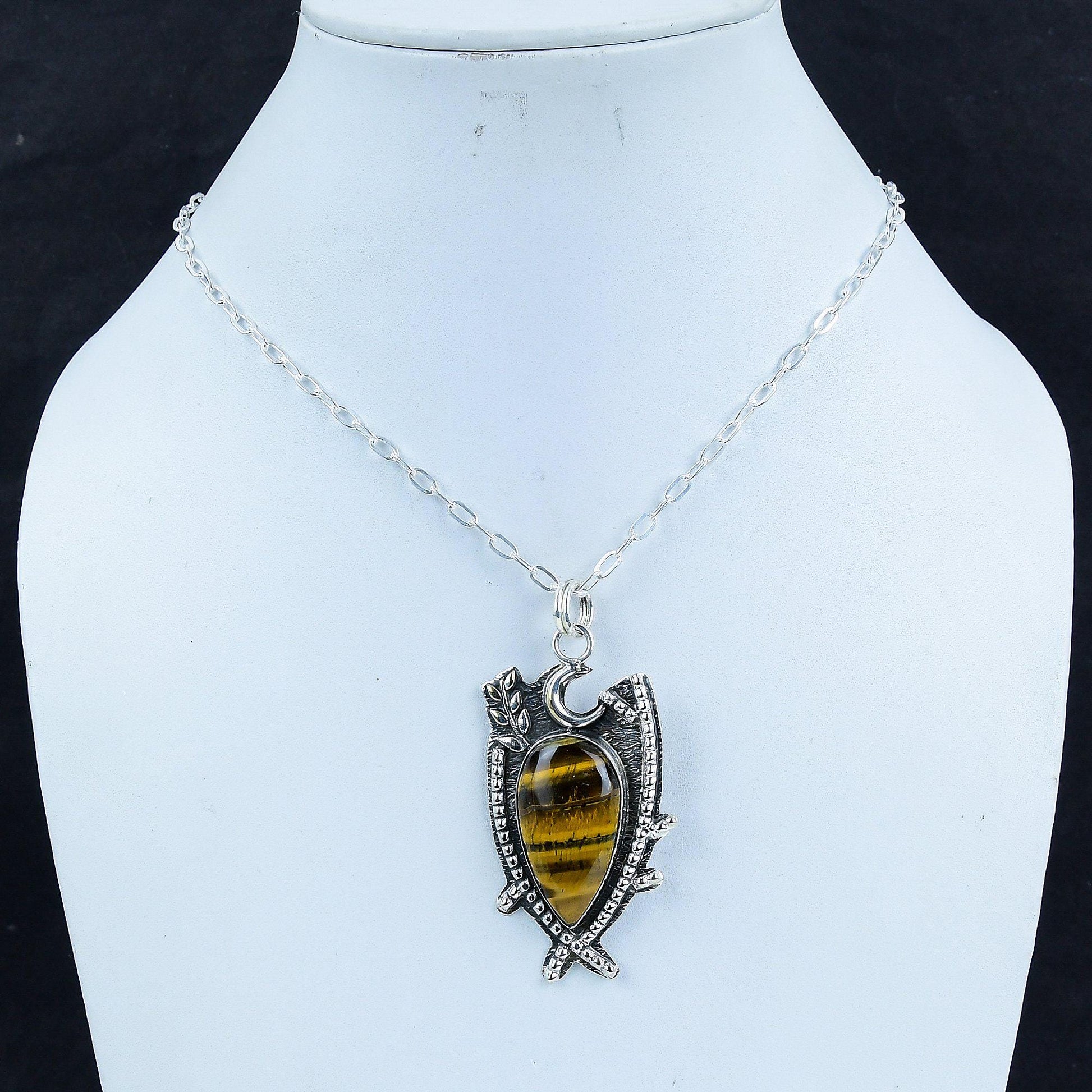 This pendant features a beautifully polished tiger's eye gemstone, known for its captivating chatoyancy and rich golden-brown hues that reflect light in mesmerizing waves.