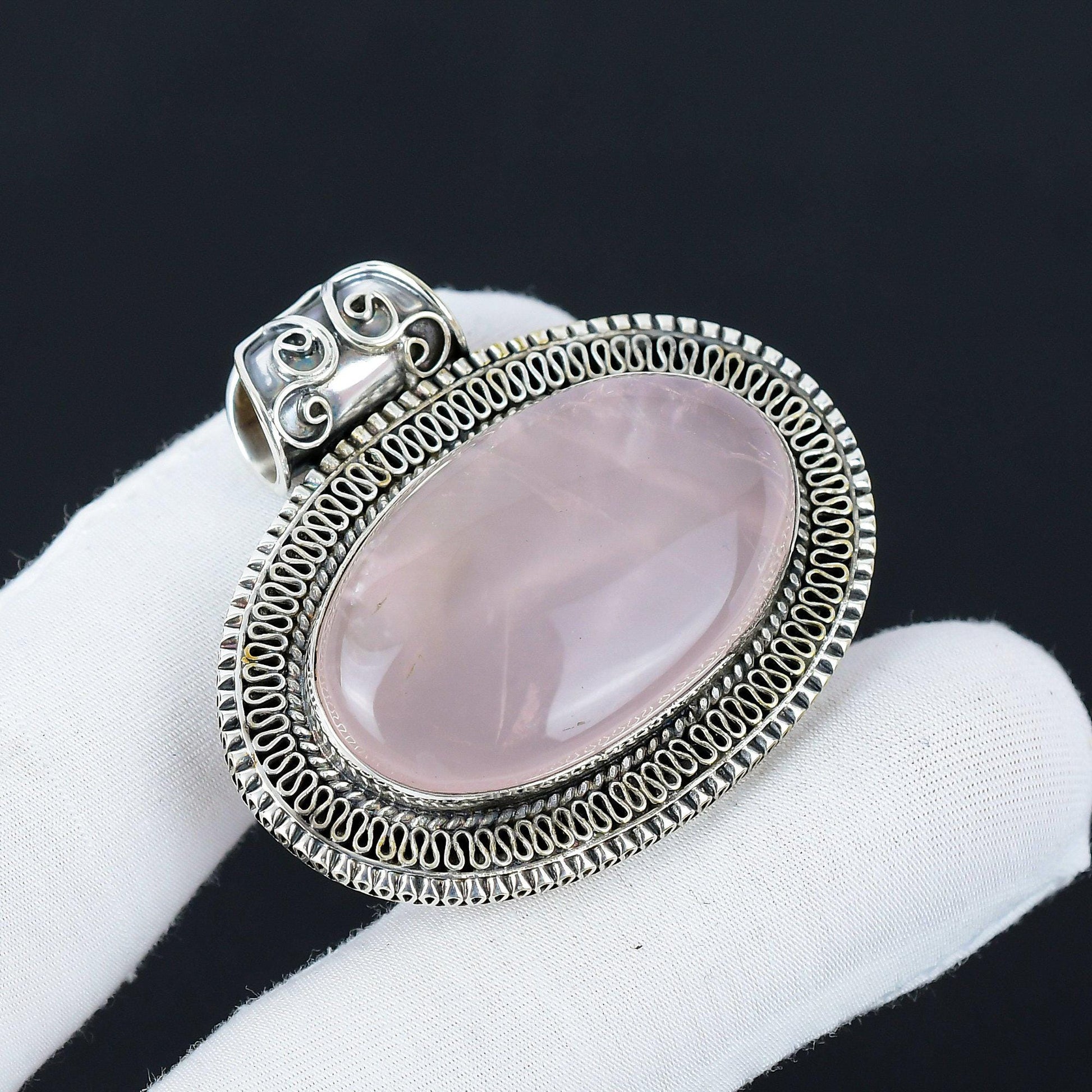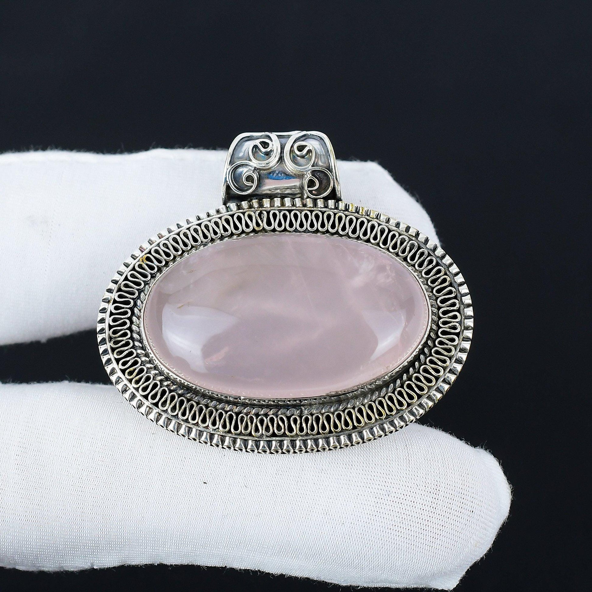 Elevate your elegance with this stunning vintage-inspired pendant, featuring a polished rose quartz centerpiece.