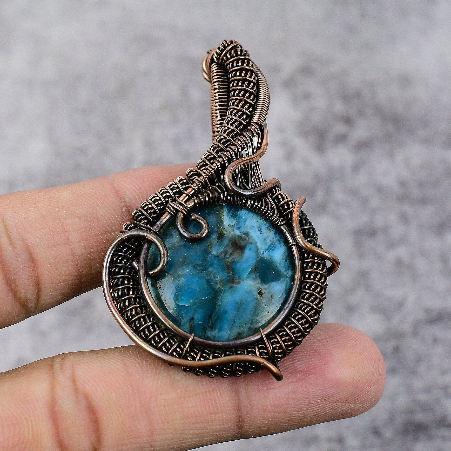 This unique piece is skillfully wrapped in intricately woven copper wire, creating an elegant and artistic design. The rustic finish of the copper beautifully complements the vibrant hues of the stone, making it a versatile accessory for any occasion.