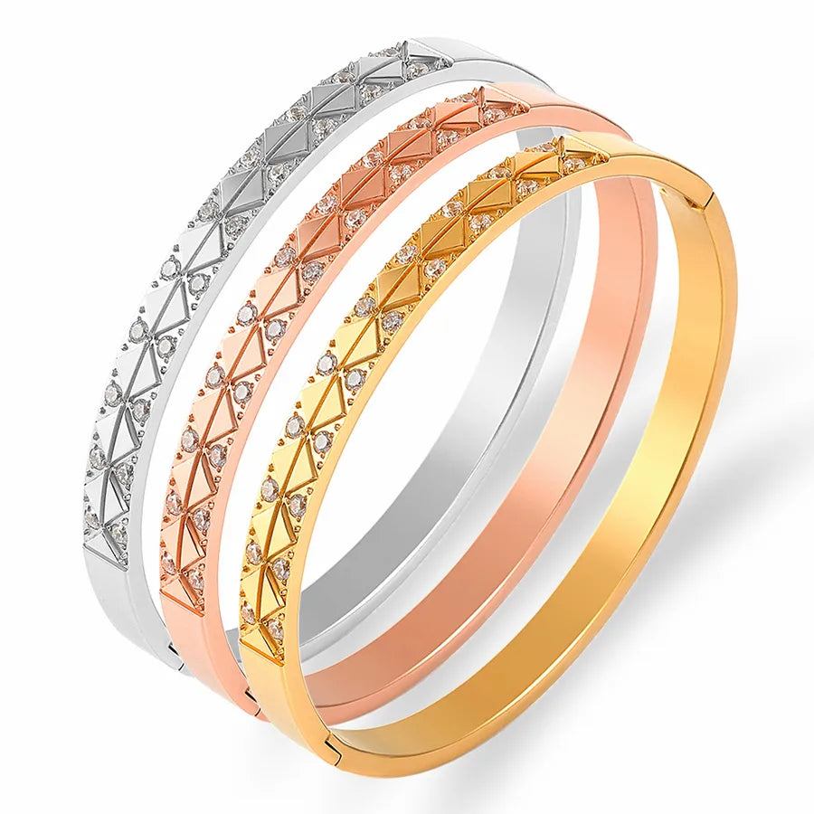 Featuring a stunning combination of silver, rose gold, and gold tones, these bracelets are adorned with intricate diamond-pattern engravings.
