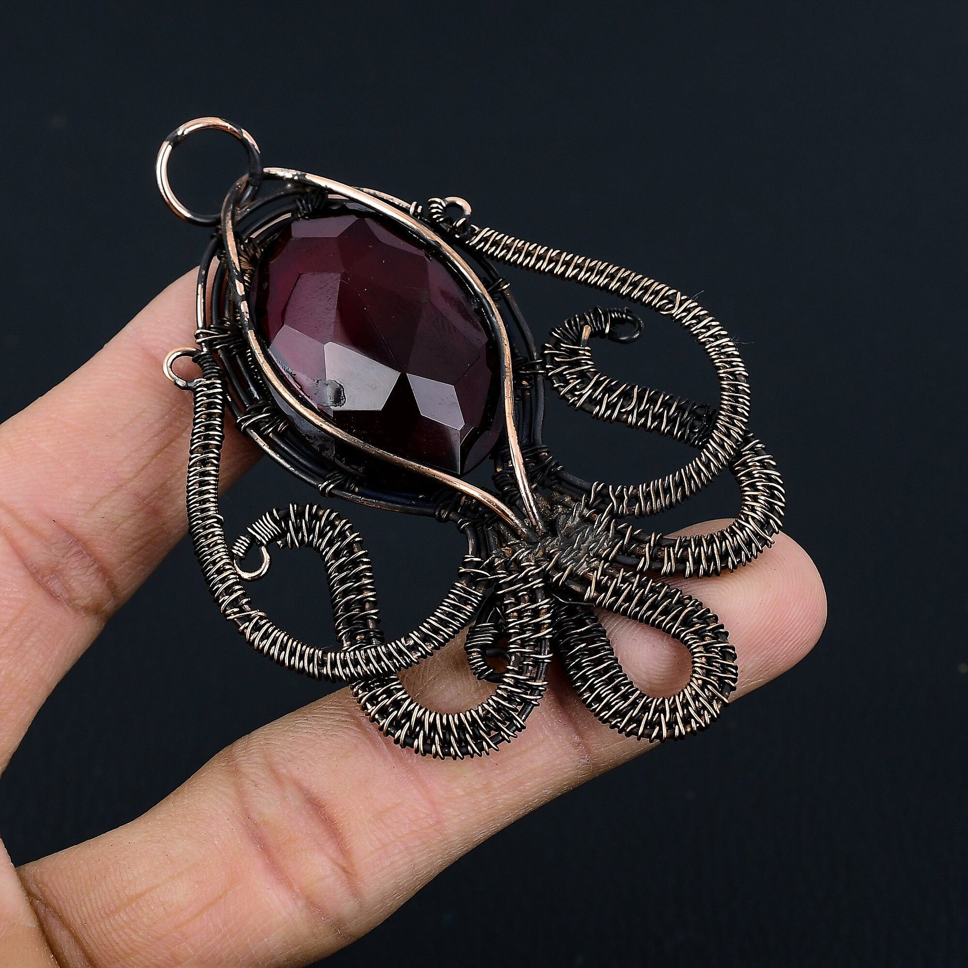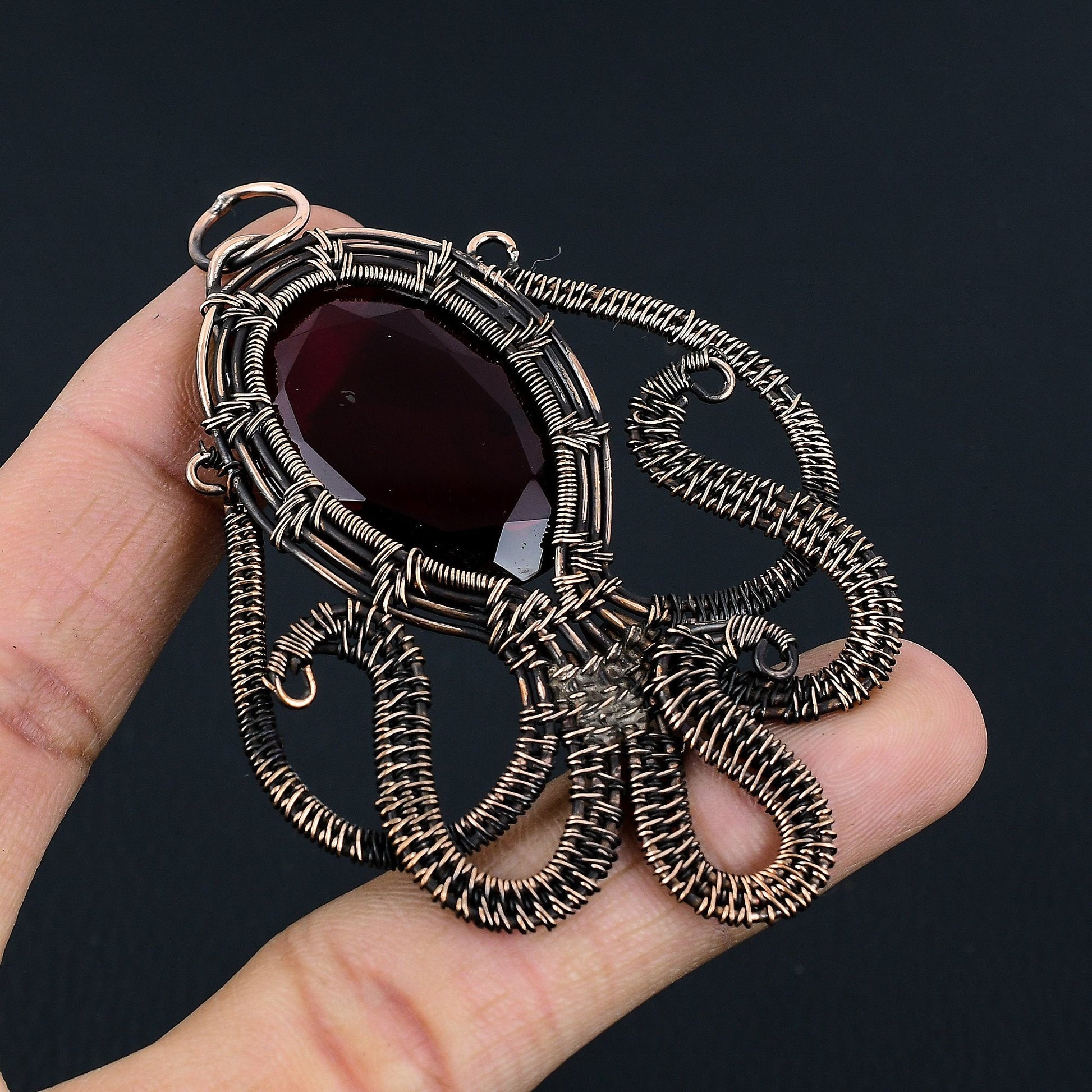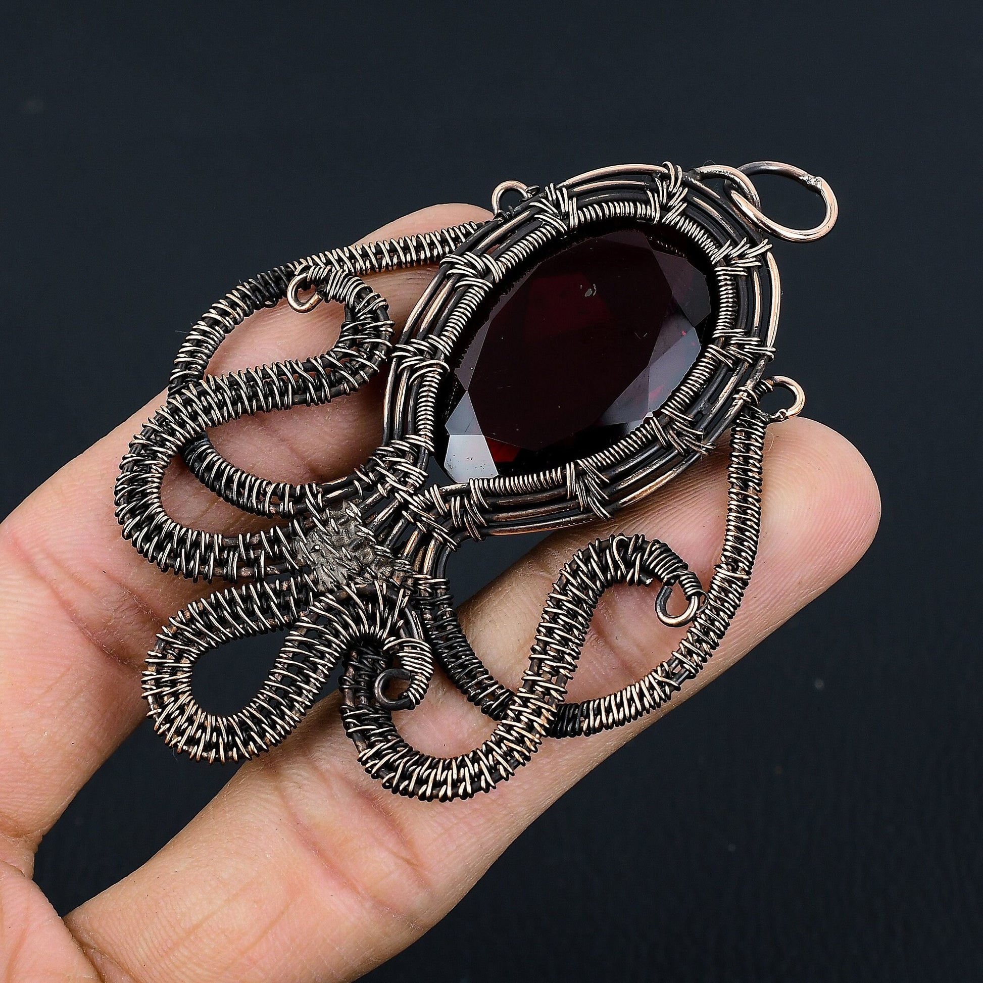 This stunning piece features a deep red gemstone, securely encased in intricate antique wire weaving.