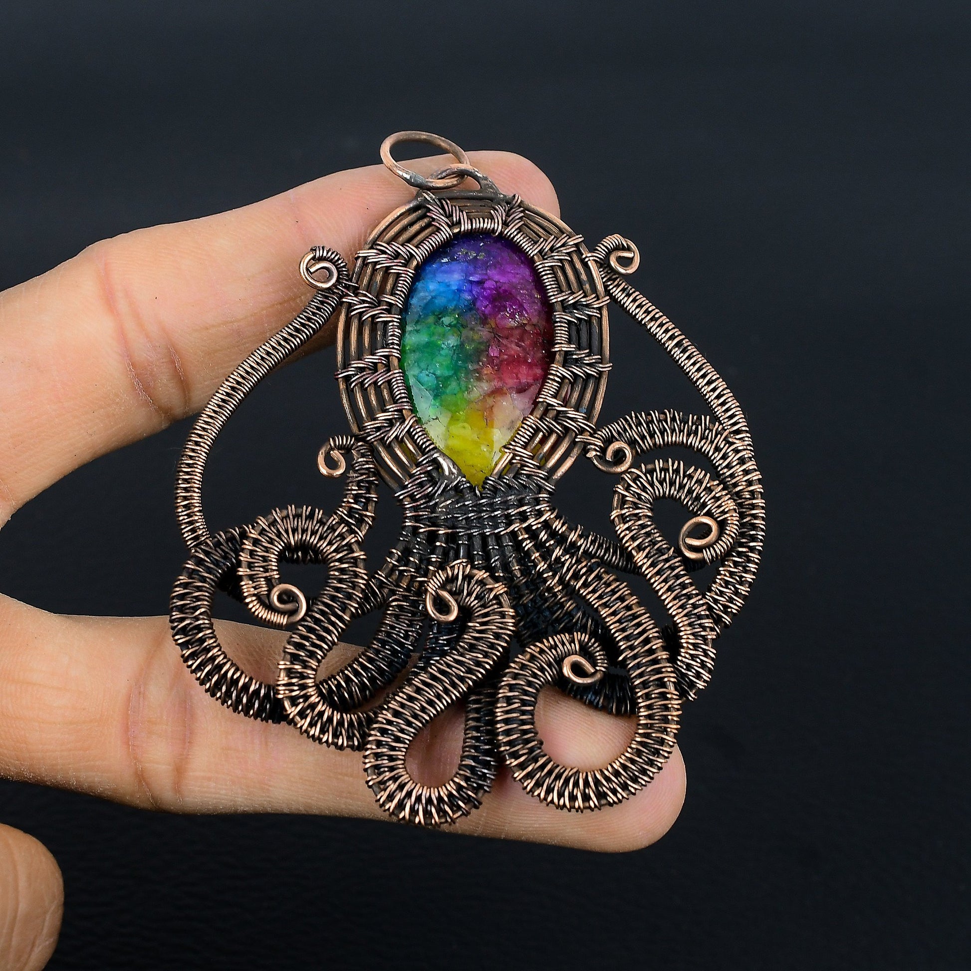 This stunning piece features intricate wirework that gracefully drapes around a vibrant, multicolored centerpiece. The rich interplay of colors makes each pendant uniquely captivating.
