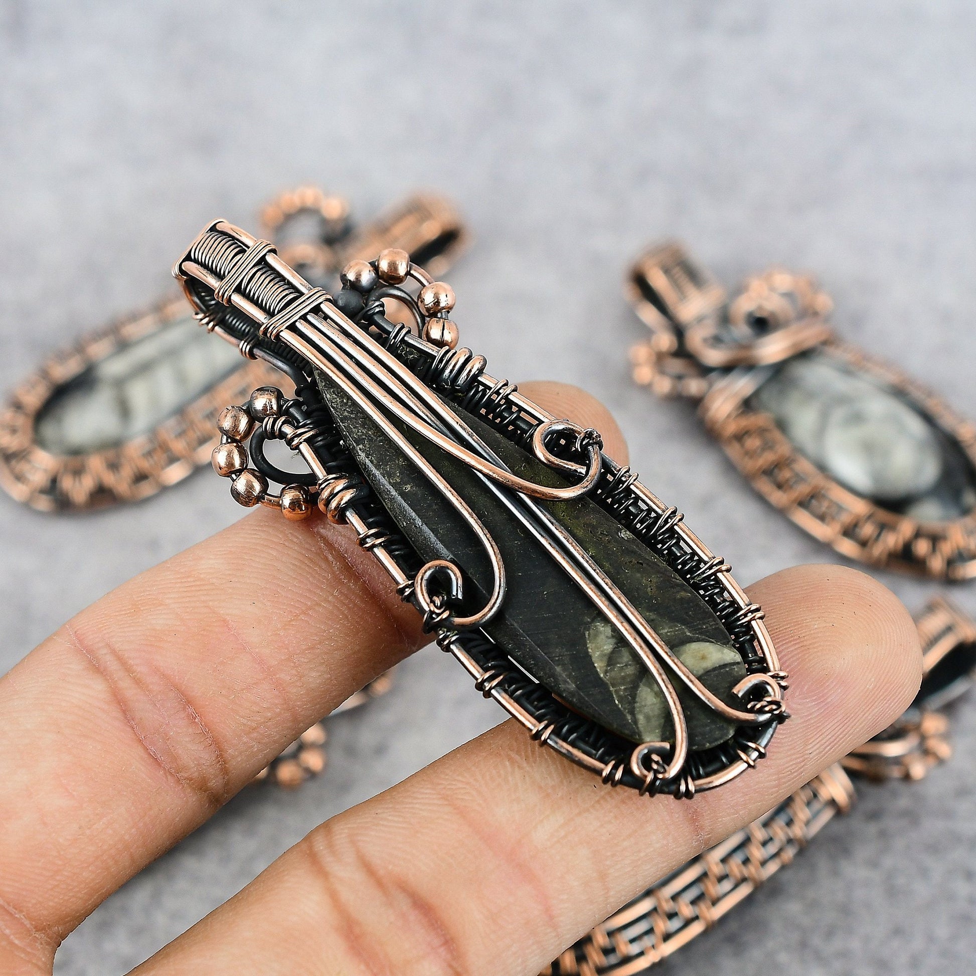 This unique piece features a captivating fossil centerpiece, elegantly wrapped with intricate wirework. The rich, earthy tones of the copper enhance the natural beauty of the fossil, creating a harmonious blend of ancient and modern artistry.