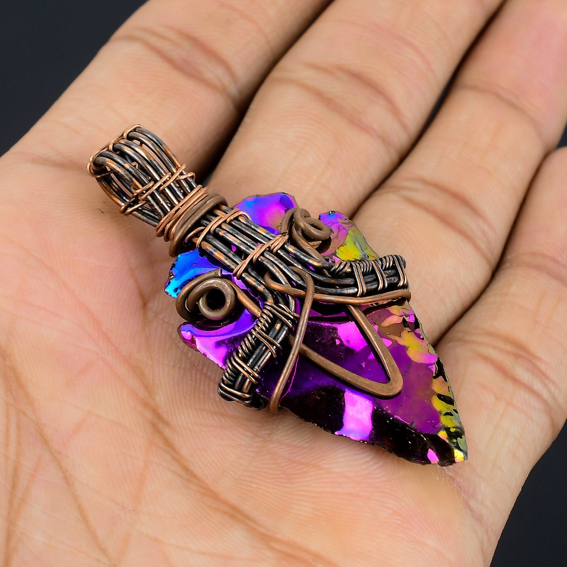 Design: This pendant showcases a beautifully crafted arrowhead design, intricately wrapped in high-quality copper wire. The electroplated coating gives the quartz an eye-catching, iridescent finish, making it a standout accessory.