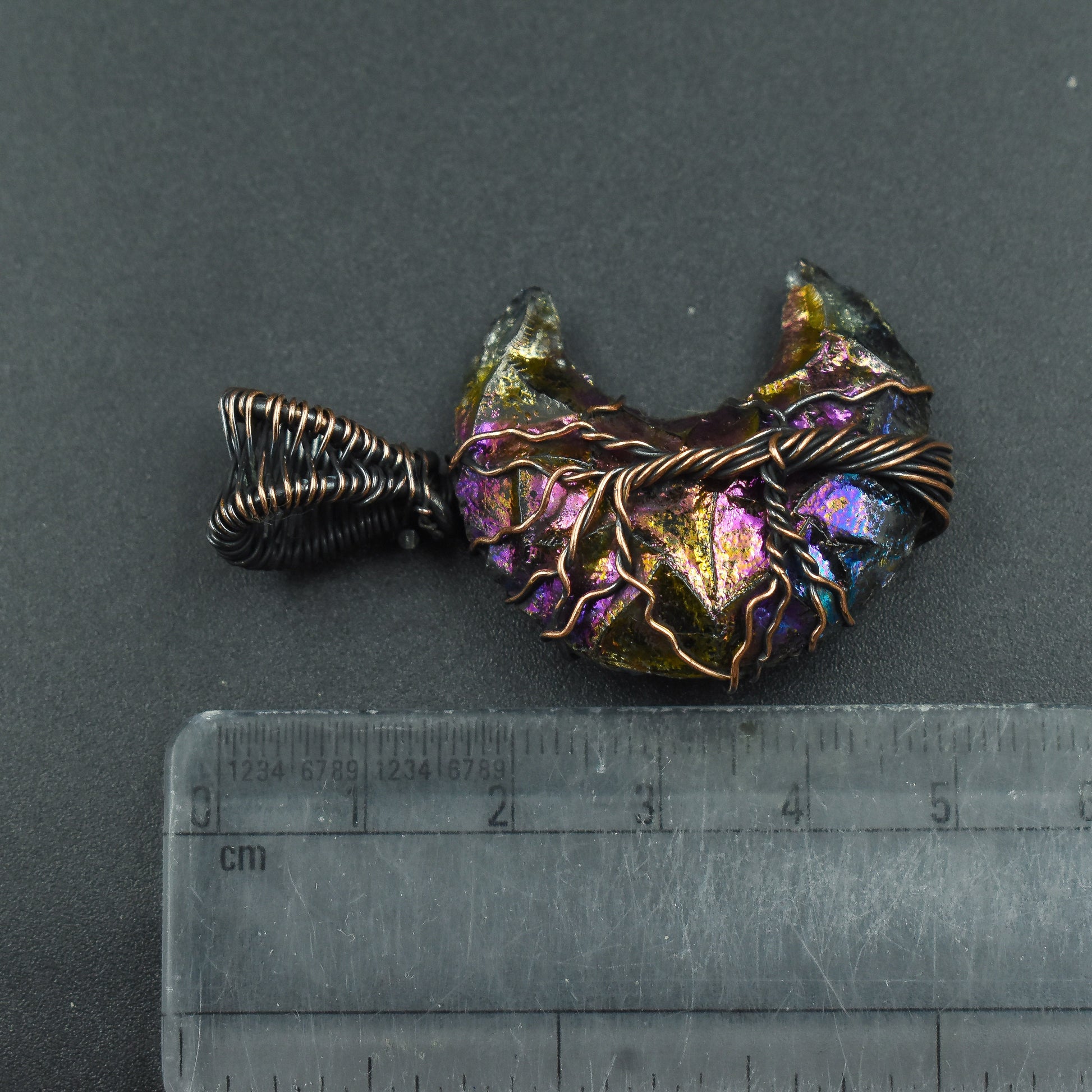 Featuring a stunning variety of iridescent hues, this pendant captures the breathtaking beauty of the night sky. Intricately wrapped in copper wire, the unique patterns and vibrant colors create a captivating celestial design.