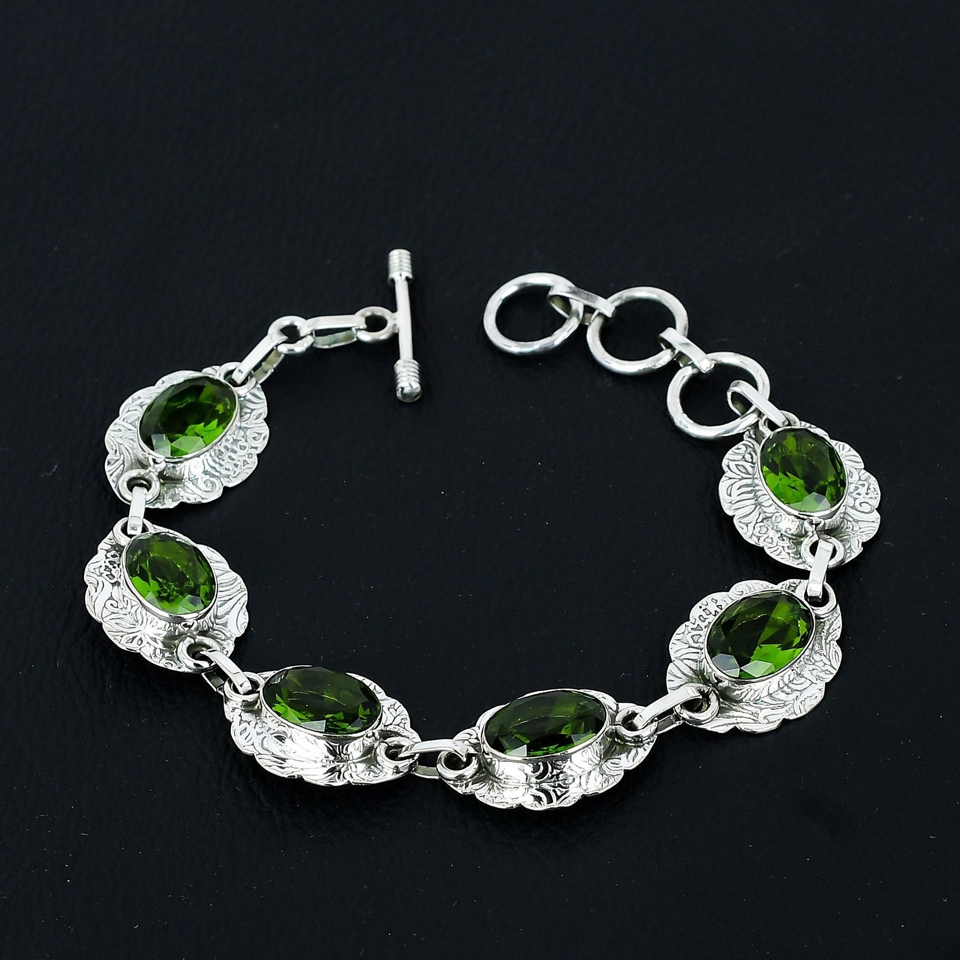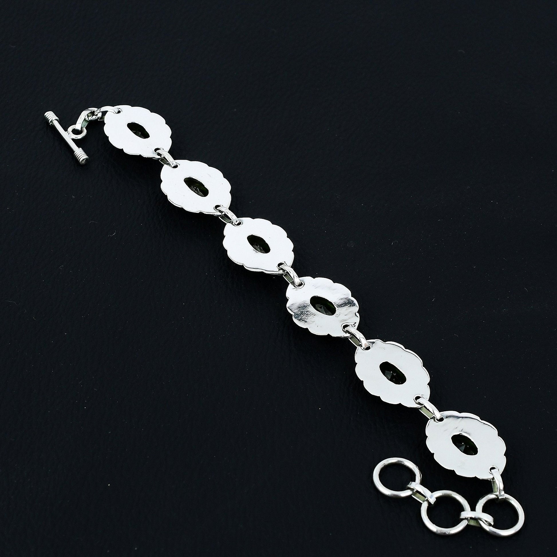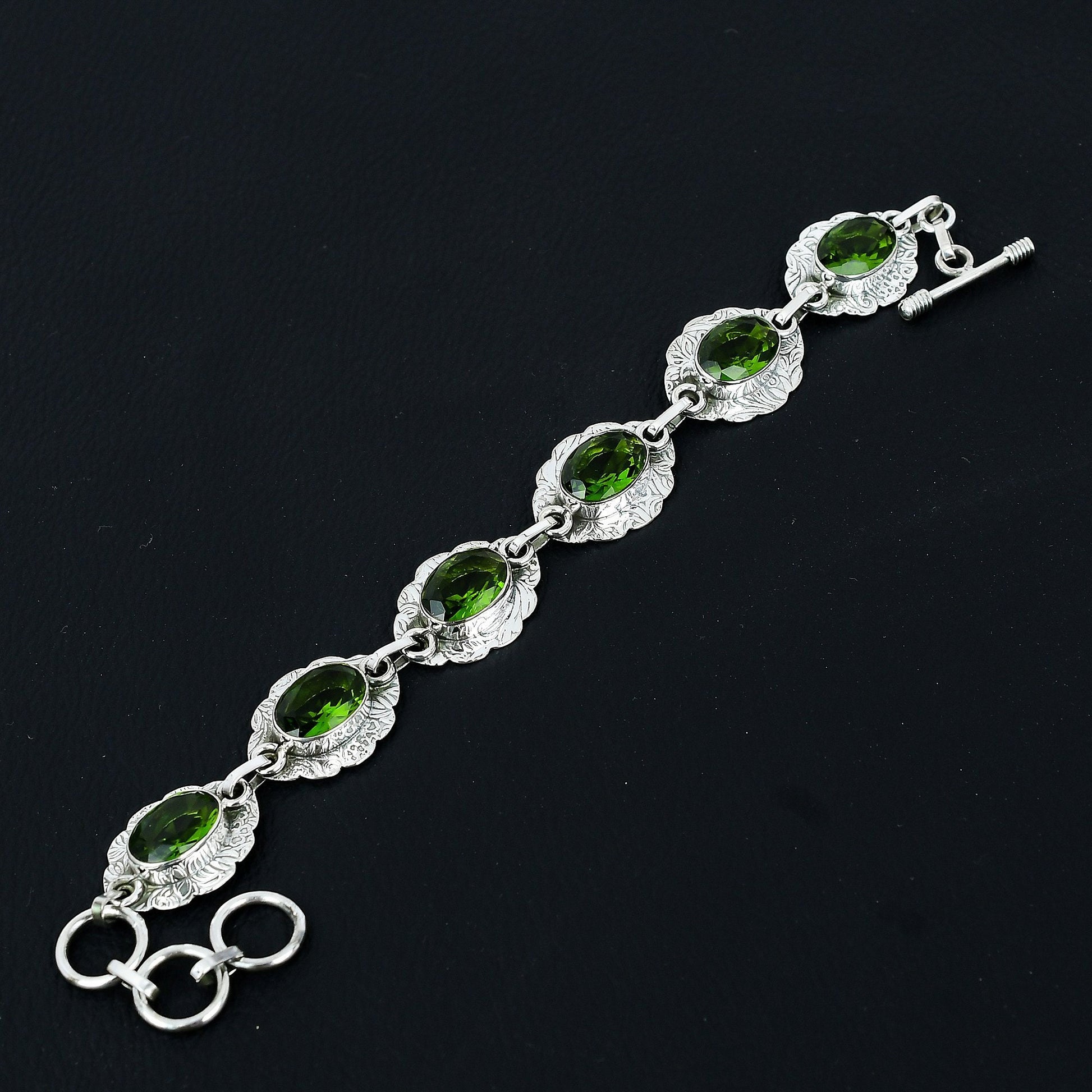 Introducing our exquisite Green Gemstone Bracelet, a perfect blend of elegance and sophistication. This stunning piece features meticulously crafted silver settings, each housing a vibrant green gemstone that shimmers with every movement.