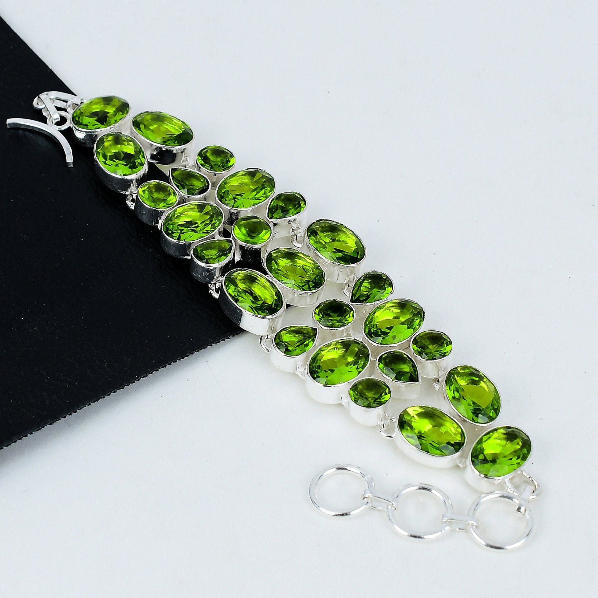 This stunning bracelet features a series of vibrant green quartz gemstones, each meticulously set in lustrous sterling silver. The unique arrangement of oval and round shapes creates a dynamic and eye-catching design.