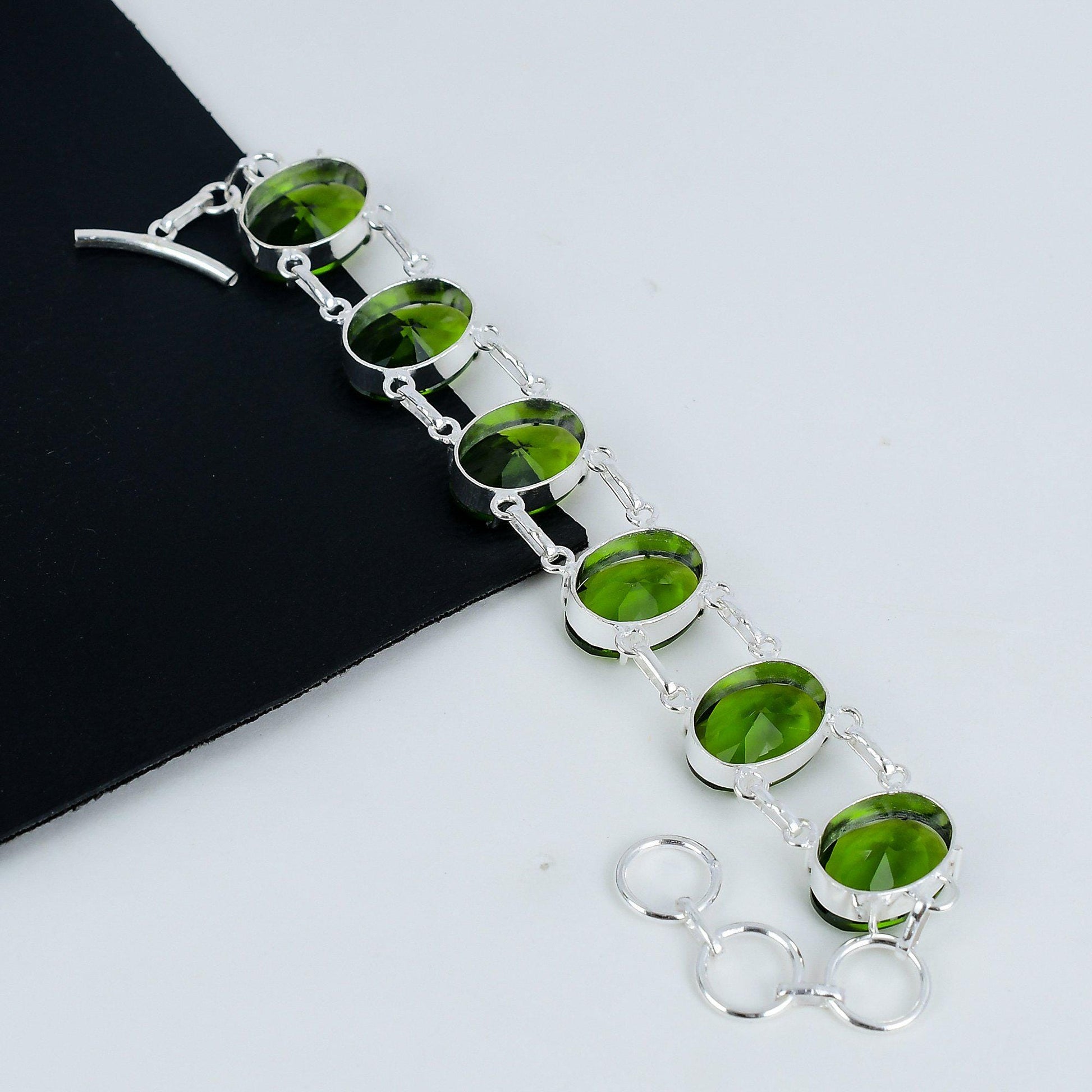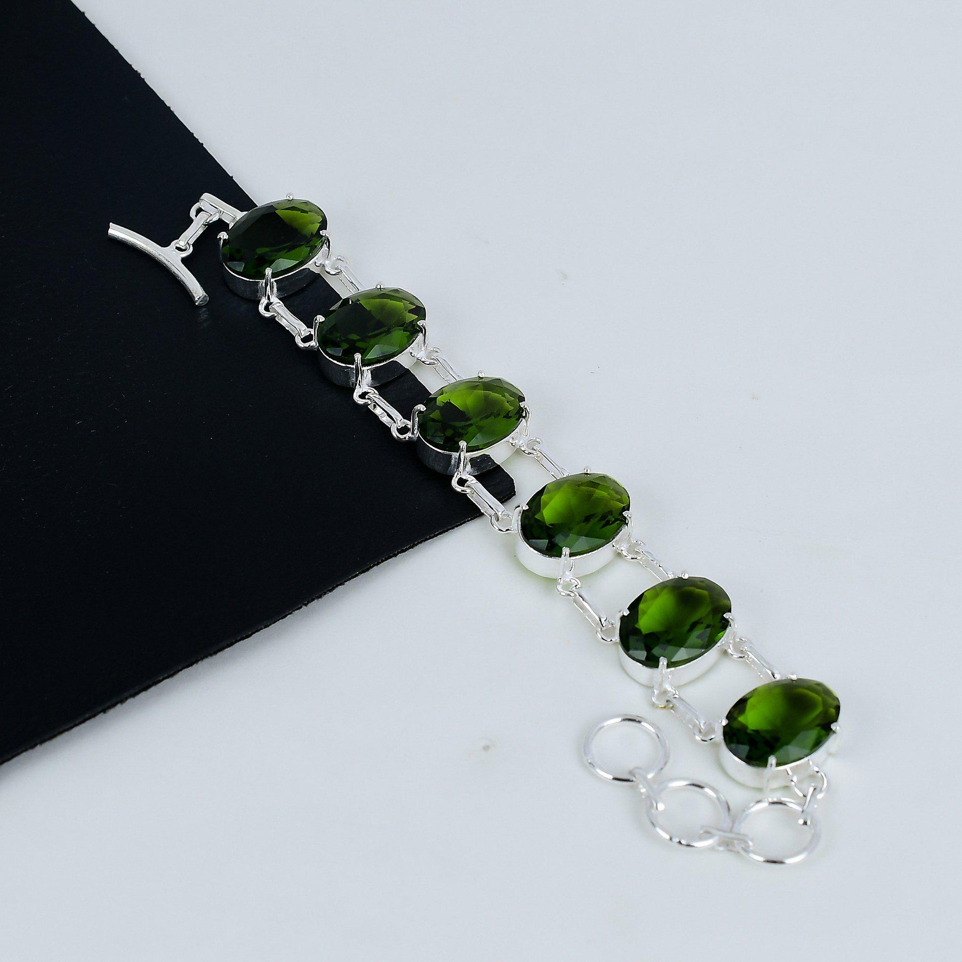 Elevate your elegance with this exquisite bracelet, featuring stunning green oval gemstones that capture the essence of natural beauty.