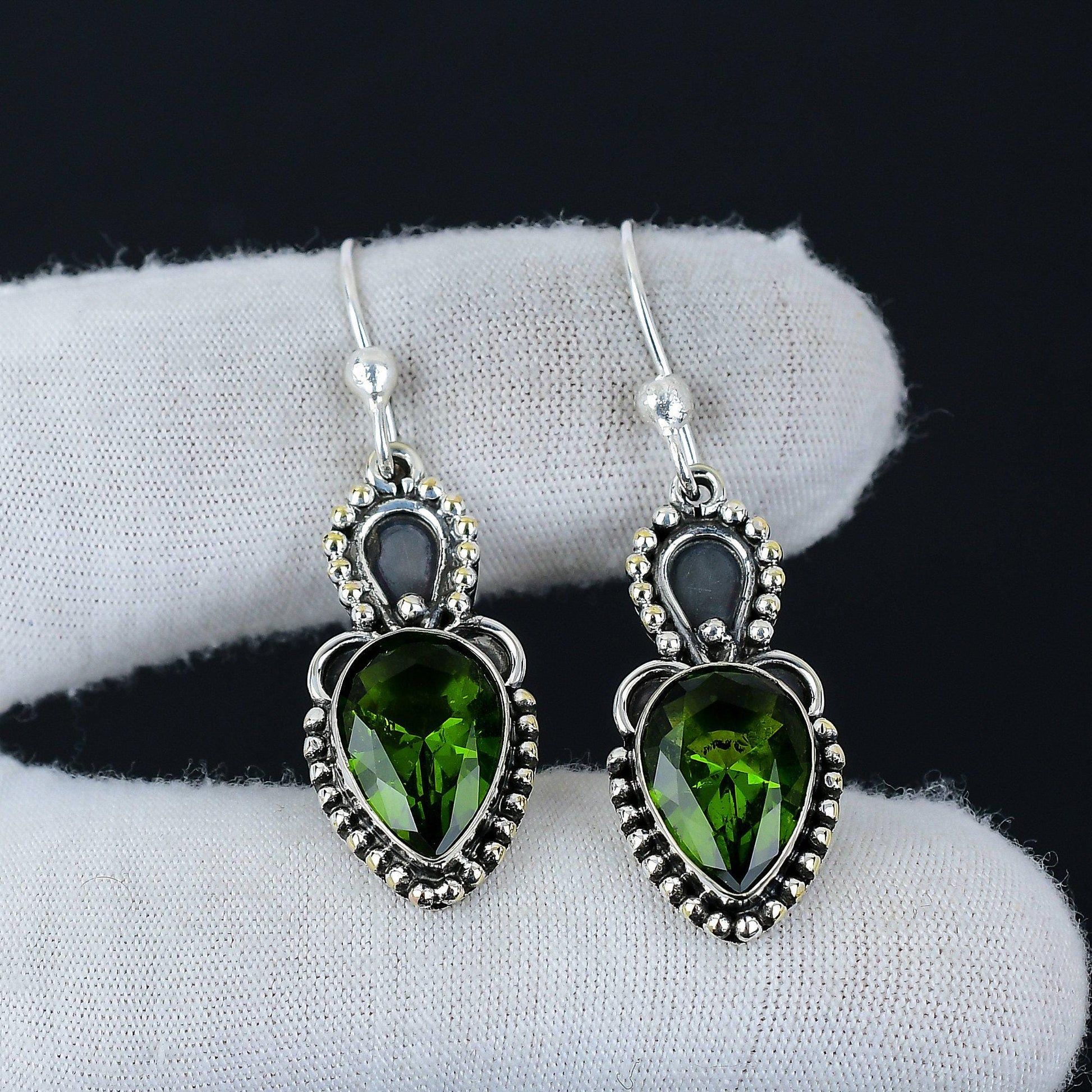 These stunning earrings feature vibrant green teardrop gemstones, meticulously crafted to catch the light beautifully.