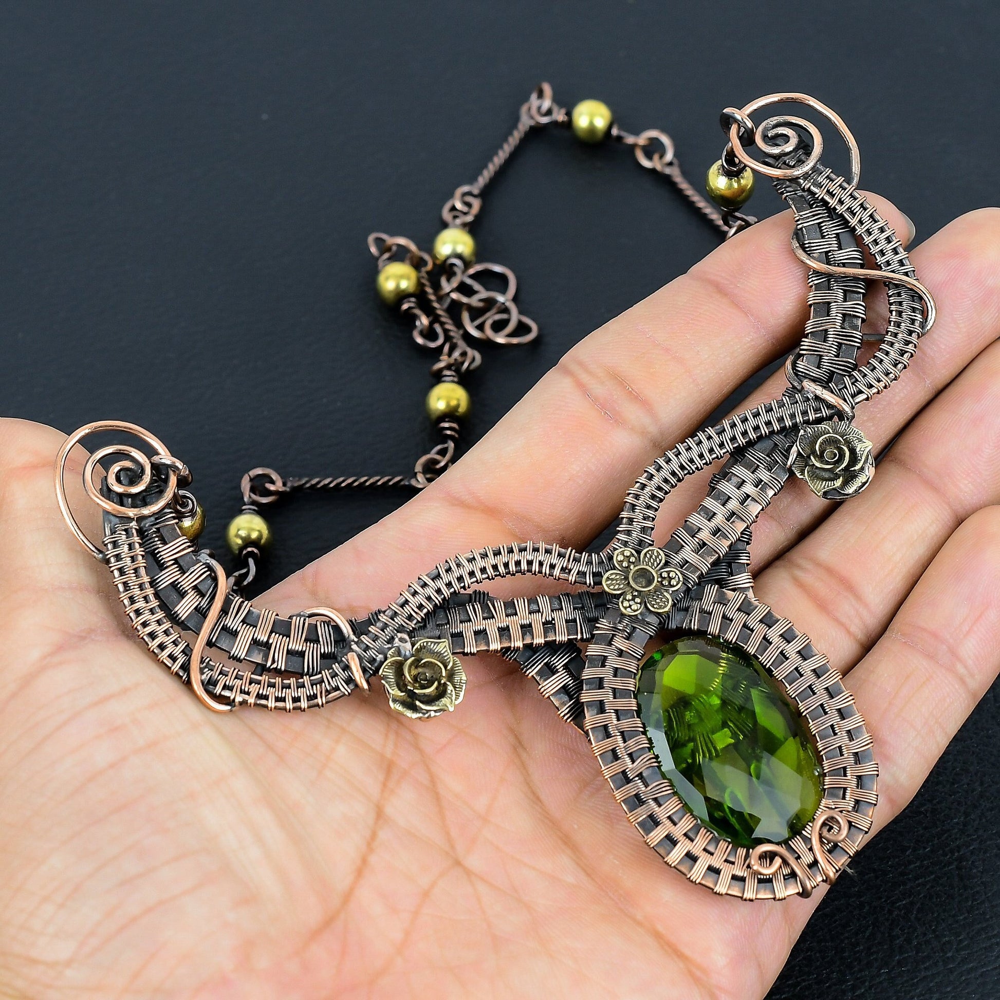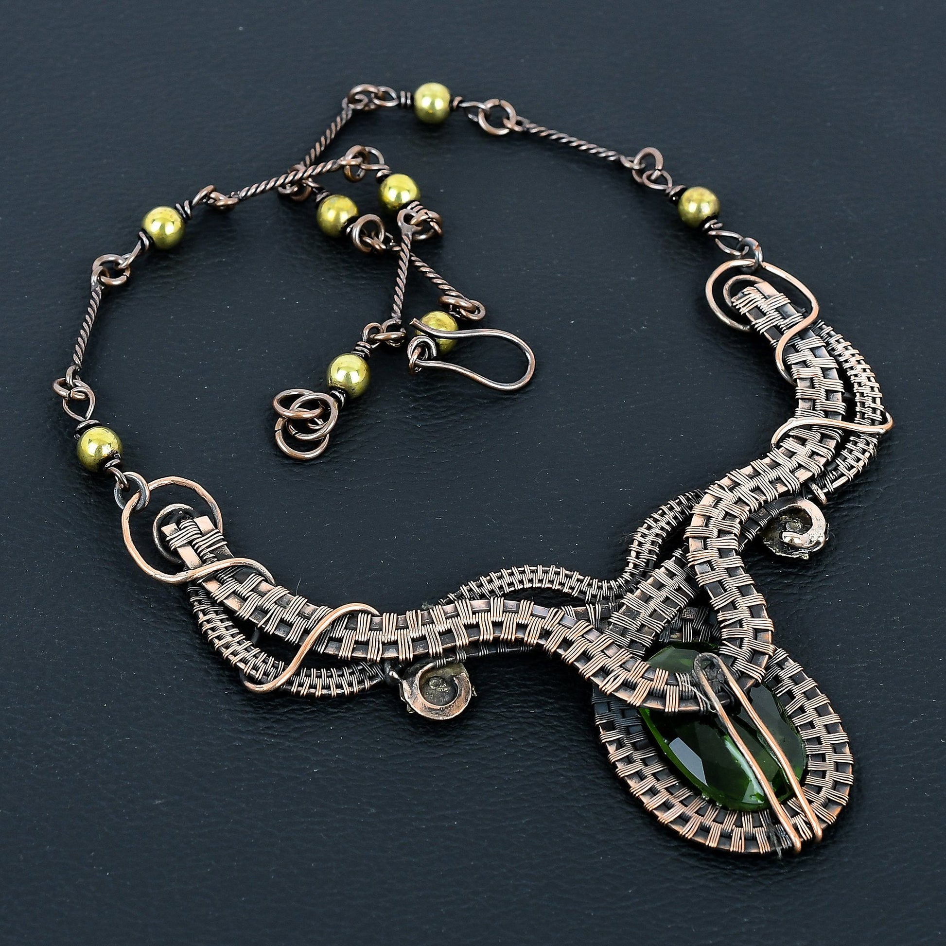 Featuring intricate wirework in a rich, antique bronze finish, this necklace beautifully wraps around a vibrant green gemstone, capturing the essence of nature's beauty.