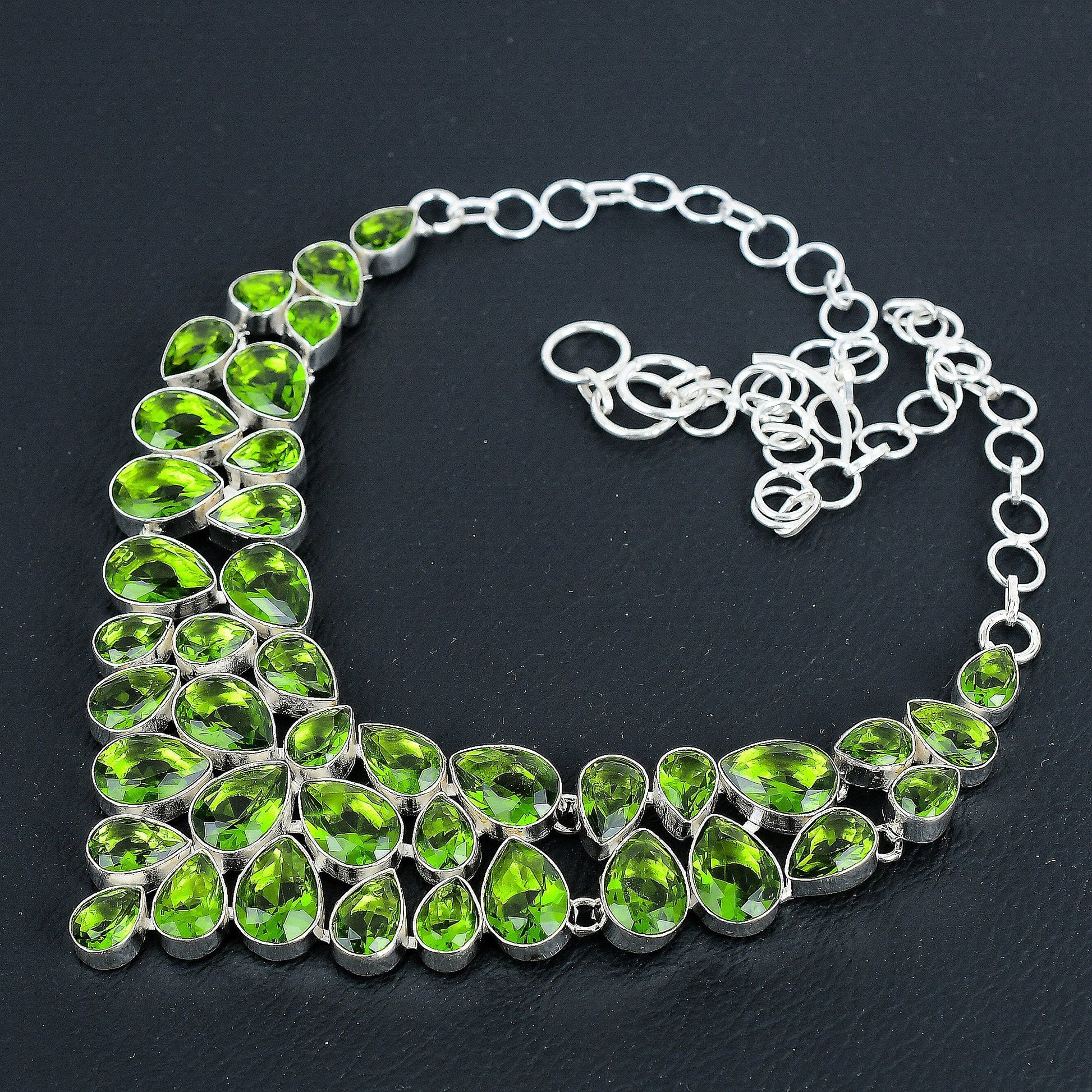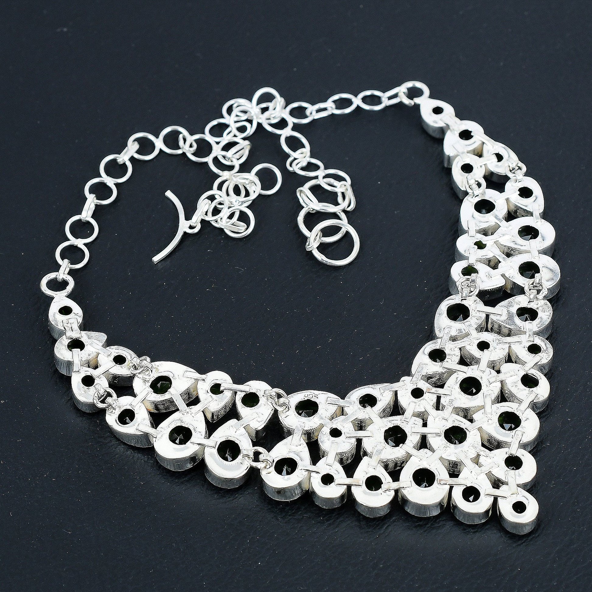 Introducing our stunning Green Gemstone Statement Necklace, a perfect blend of elegance and sophistication. This exquisite piece features meticulously crafted, vibrant green gemstones set in a sleek silver-toned chain.