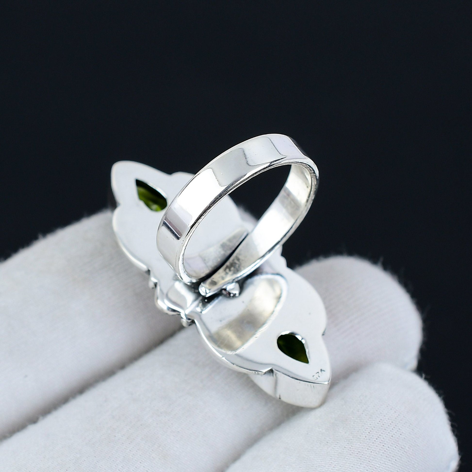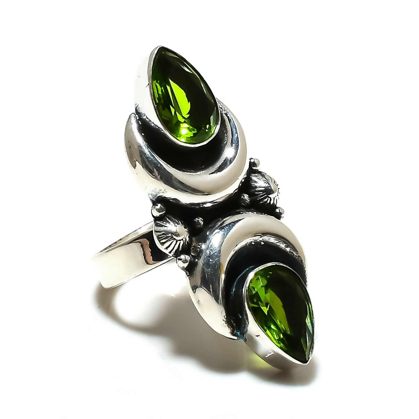 Crafted with precision, this ring features two alluring green gemstones set in crescent-shaped silver mounts. The intricate detailing and glossy finish add a touch of luxury, making it an ideal accessory for any occasion.