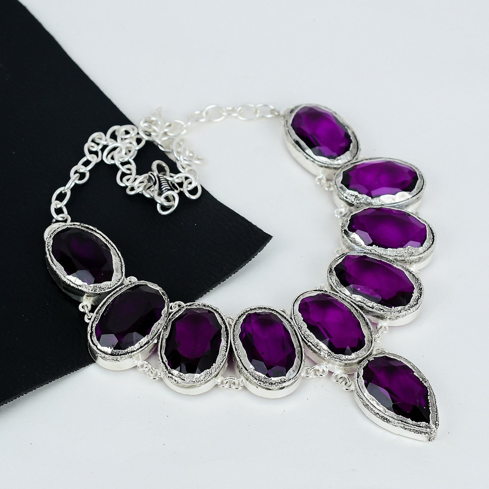 Indulge in elegance with our exquisite statement necklace, featuring stunning purple gemstones that captivate with their deep, vibrant hue.