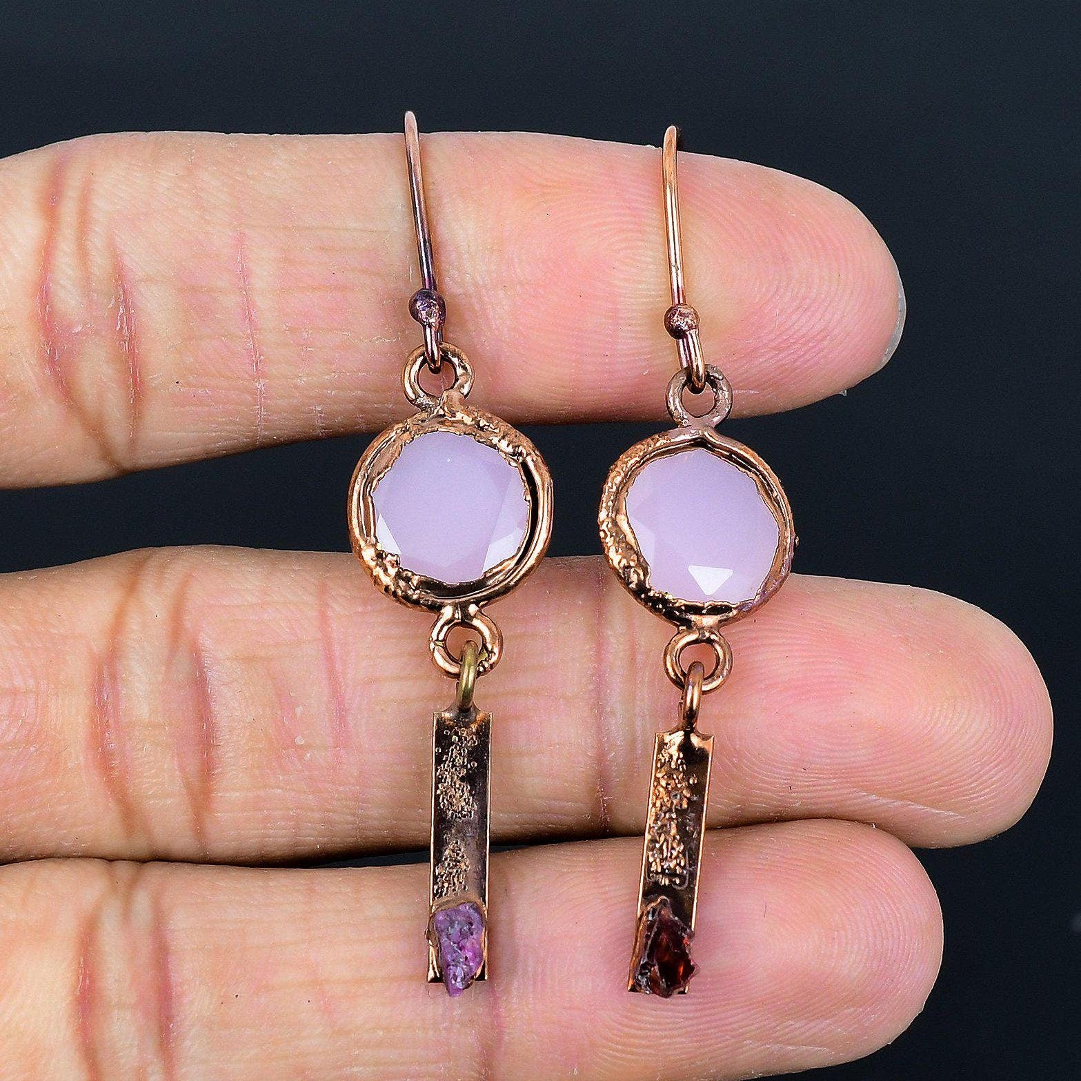 Featuring a unique blend of rustic copper tones and delicate pastel gems, these earrings are a perfect statement piece for any occasion.