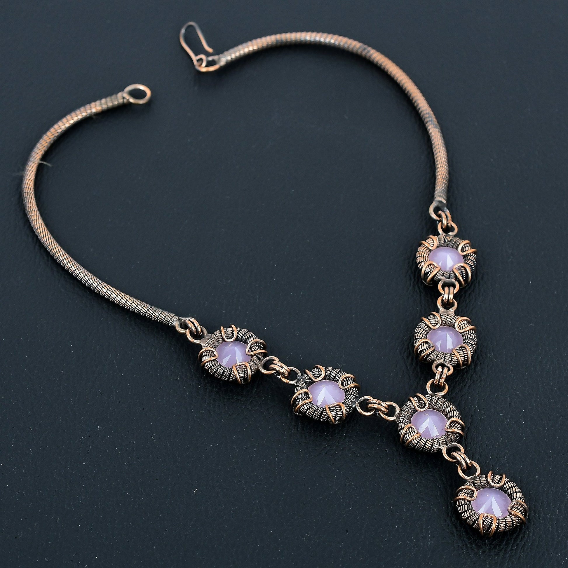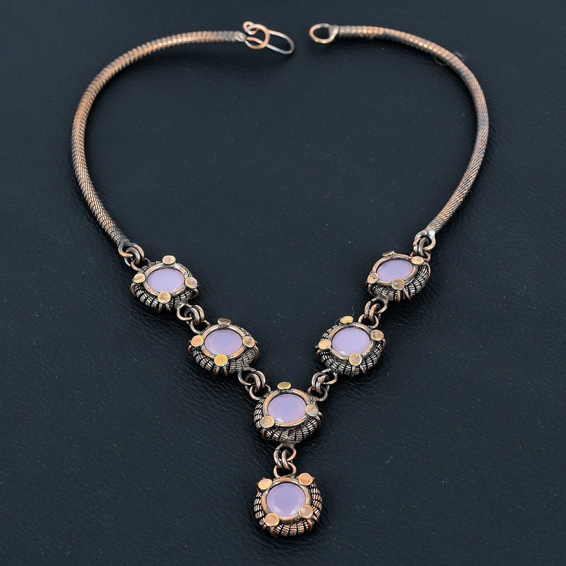Enhance your elegance with our exquisitely crafted vintage-inspired necklace, featuring an array of lavender-hued gemstones encased in intricate antique metal settings.