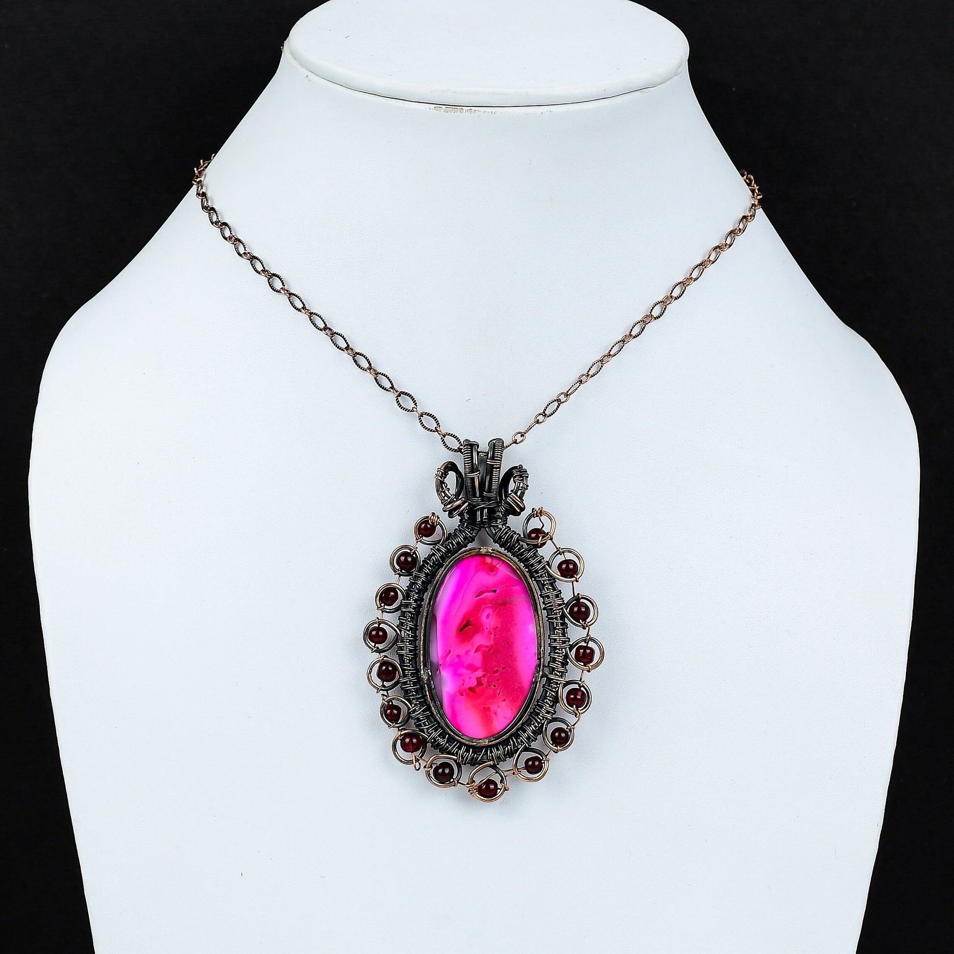Discover the allure of our handcrafted pendant featuring a vibrant pink stone, meticulously wrapped in intricately woven wire.