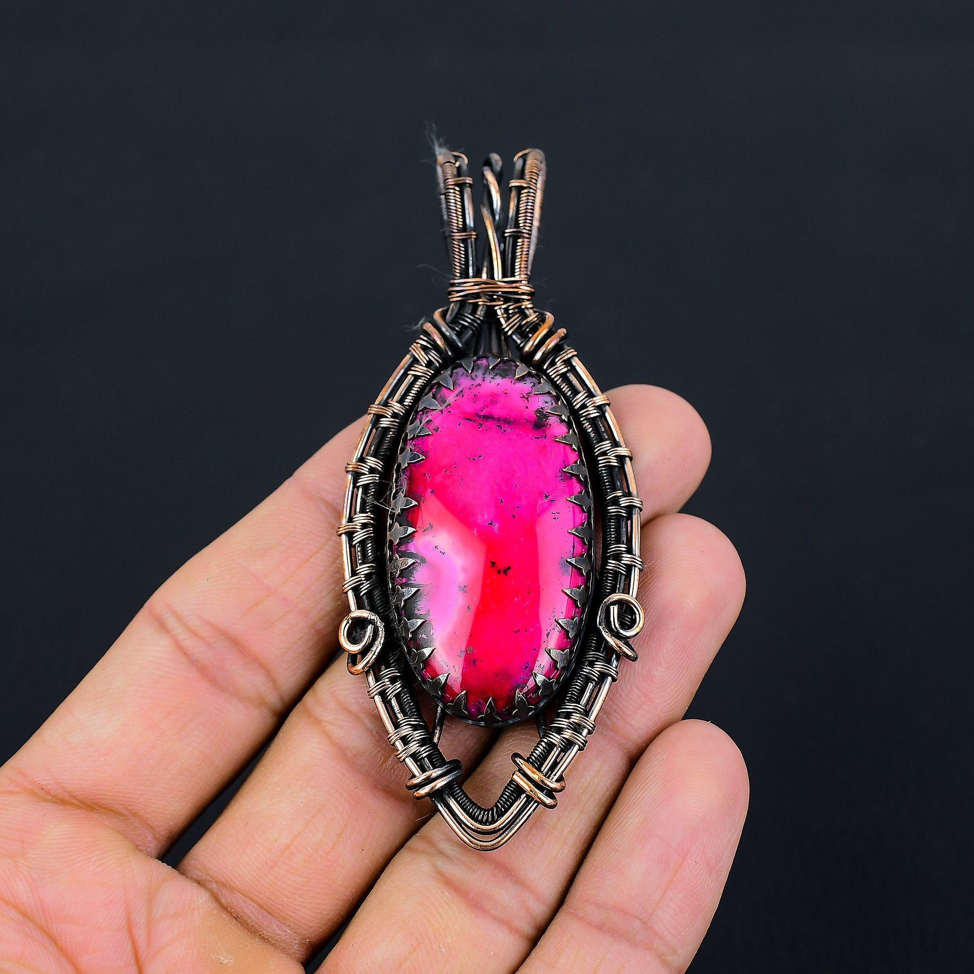 This exquisite pendant showcases a striking pink gemstone, elegantly encased in an intricate wire-wrapped design.
