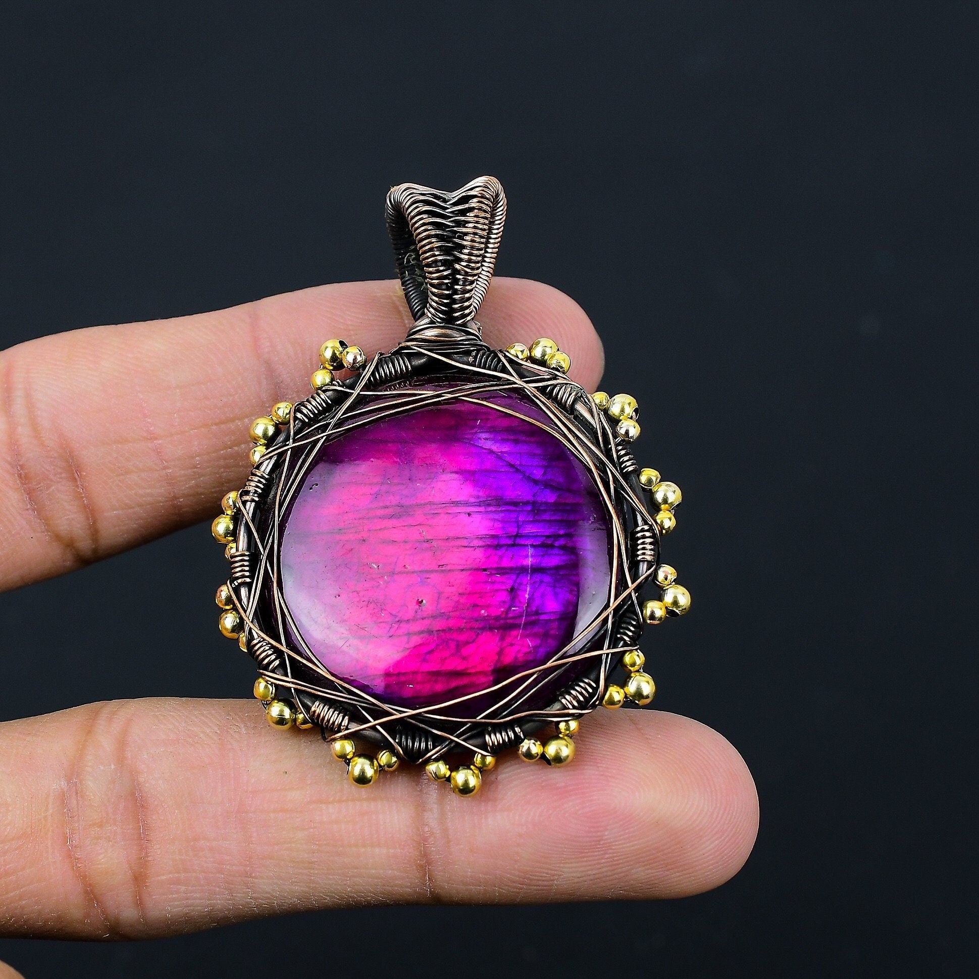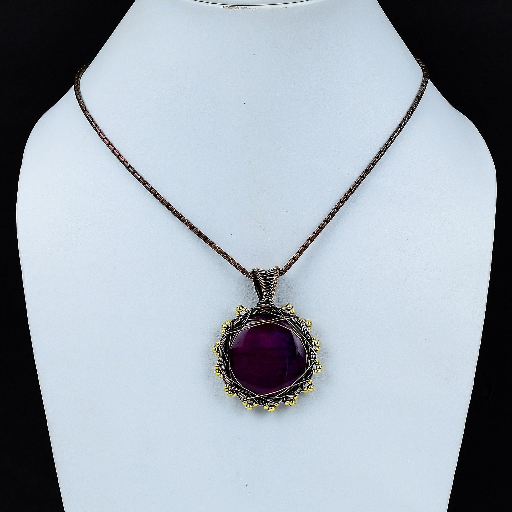 Discover the captivating beauty of this handcrafted pendant, featuring a mesmerizing magenta centerpiece. This bold and elegant design is intricately wrapped with a blend of silver and bronze tones, accentuated by delicate wire work and golden bead embellishments.