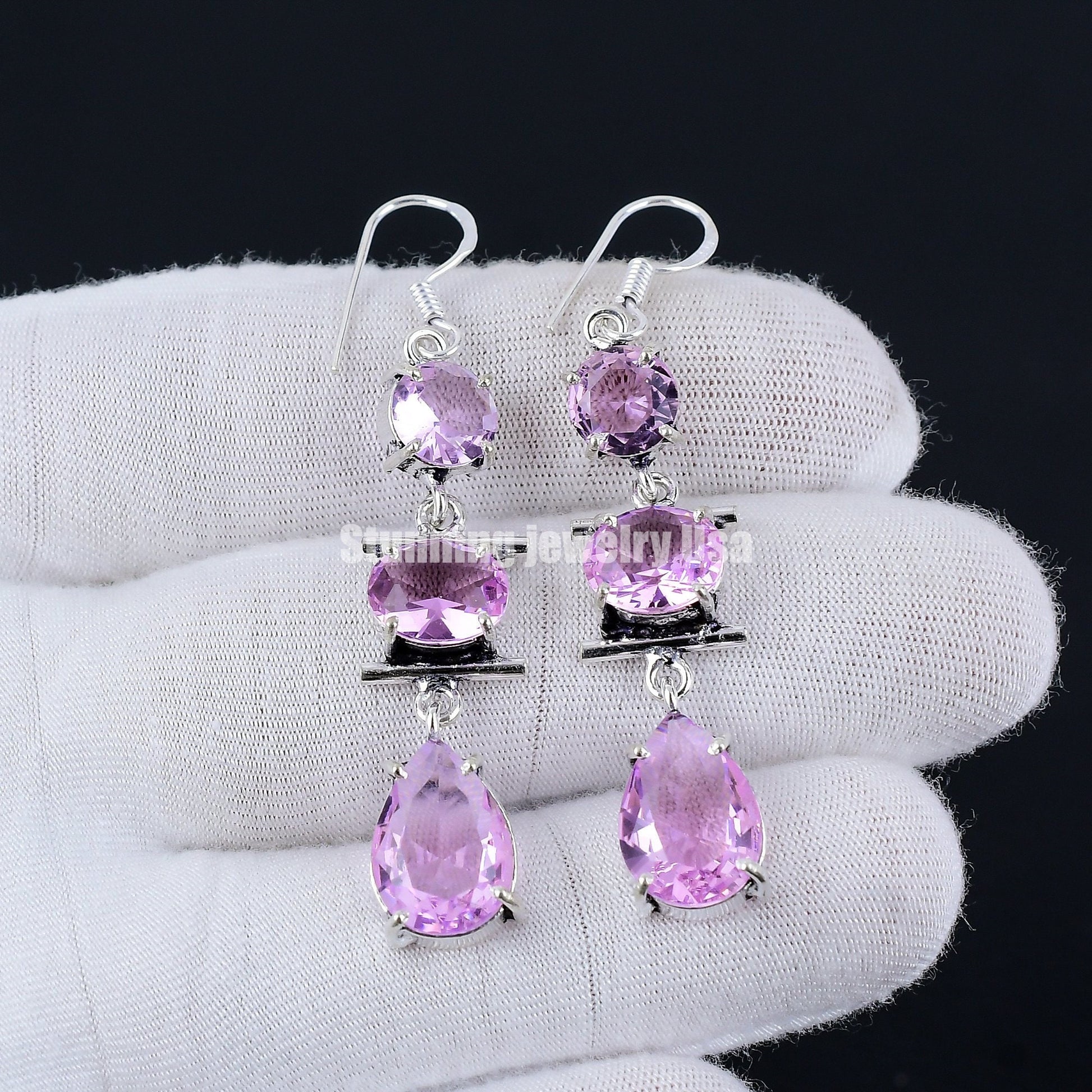 💎 Featuring a stunning trio of oval and teardrop-shaped amethyst stones, these earrings exude a brilliant lavender hue that captures the light beautifully.