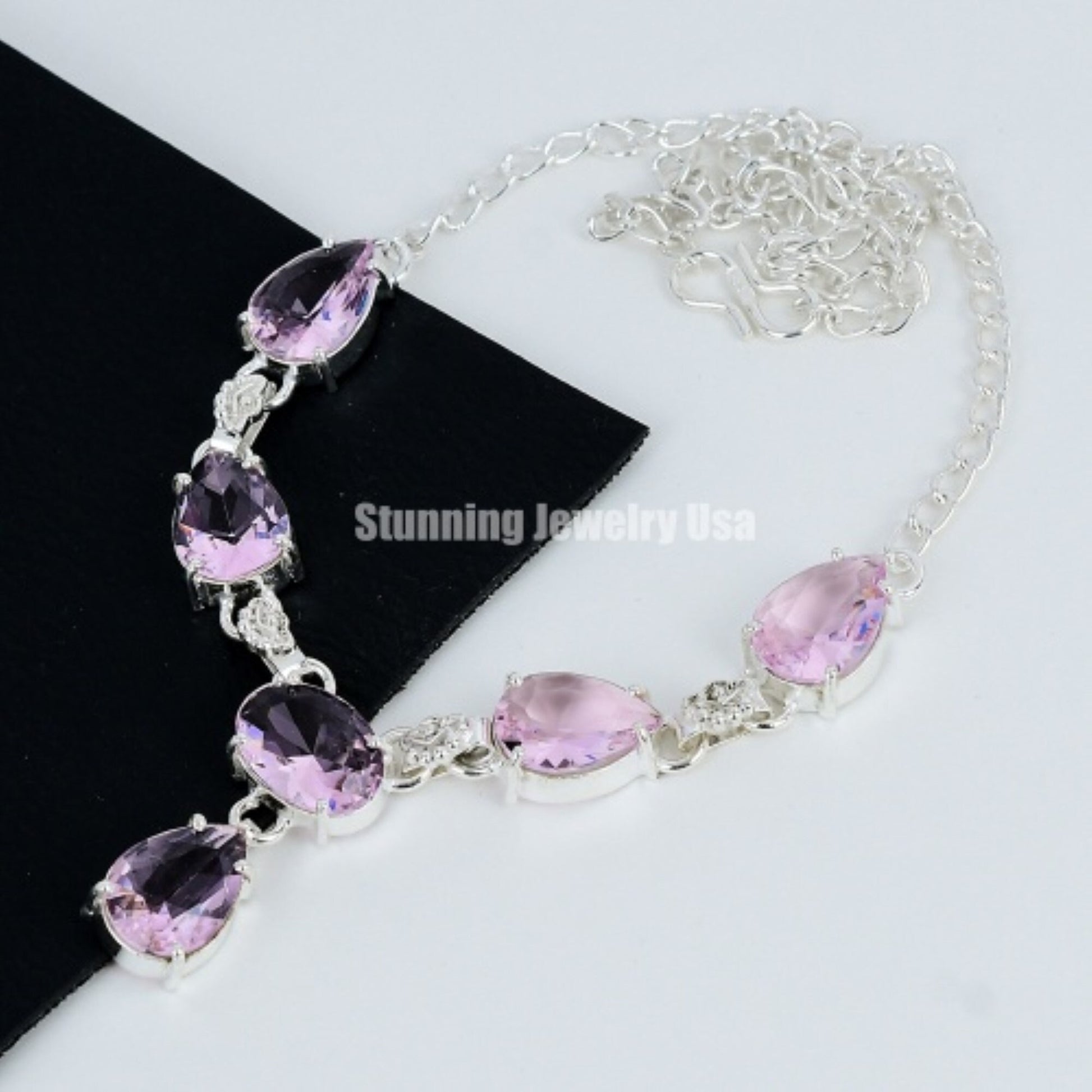 This stunning piece features a series of teardrop-shaped pink stones, each meticulously cut to perfection and set in a high-quality silver chain.