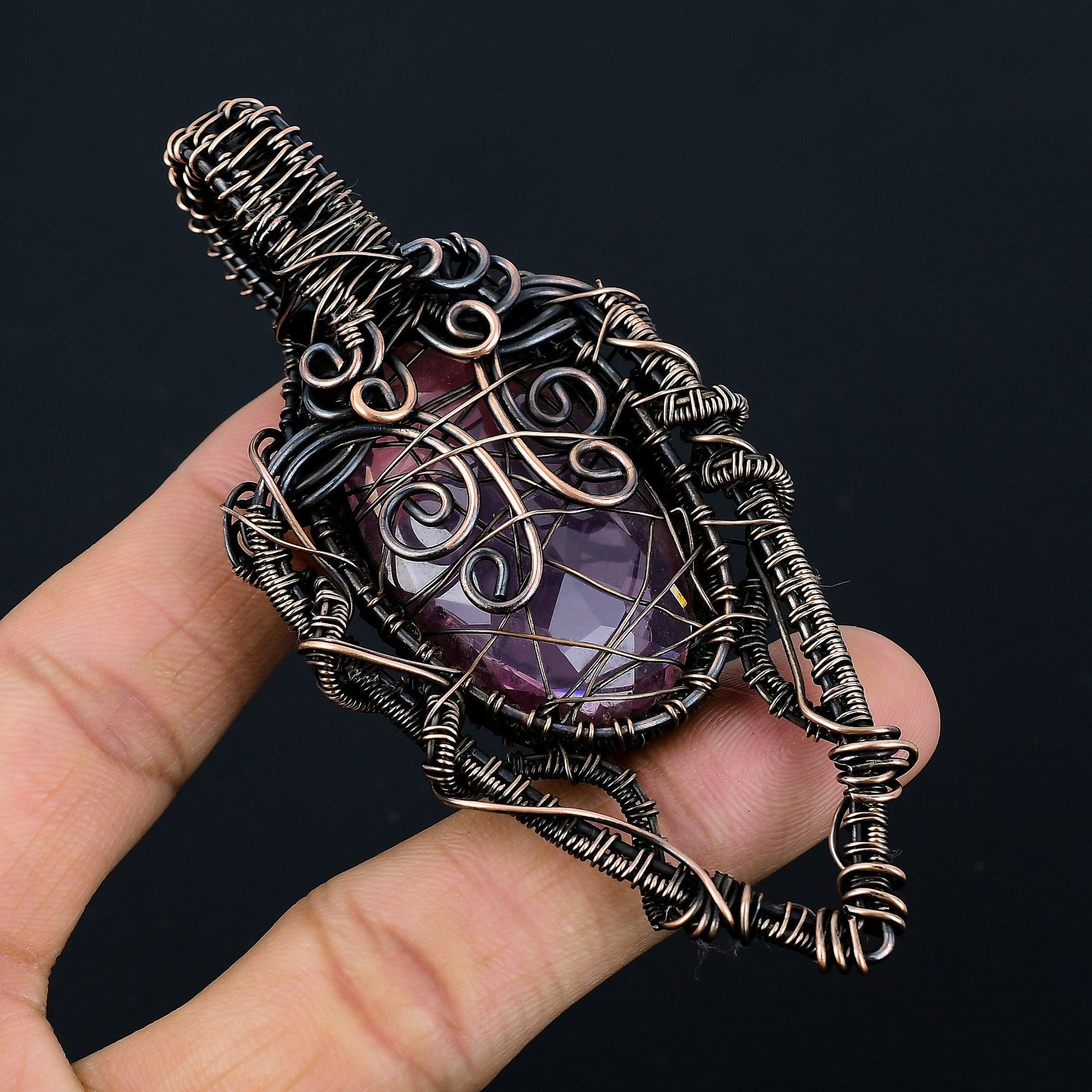 This stunning piece features a beautifully faceted amethyst, meticulously wrapped in intricate wire patterns that create a statement of timeless beauty.