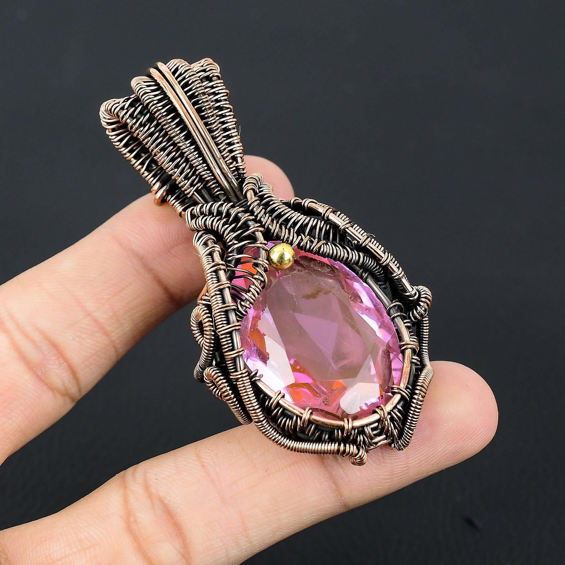 This handcrafted pendant features an intricate wire-wrapping design that elegantly frames a stunning pink gemstone, adding a touch of sophistication to any outfit.