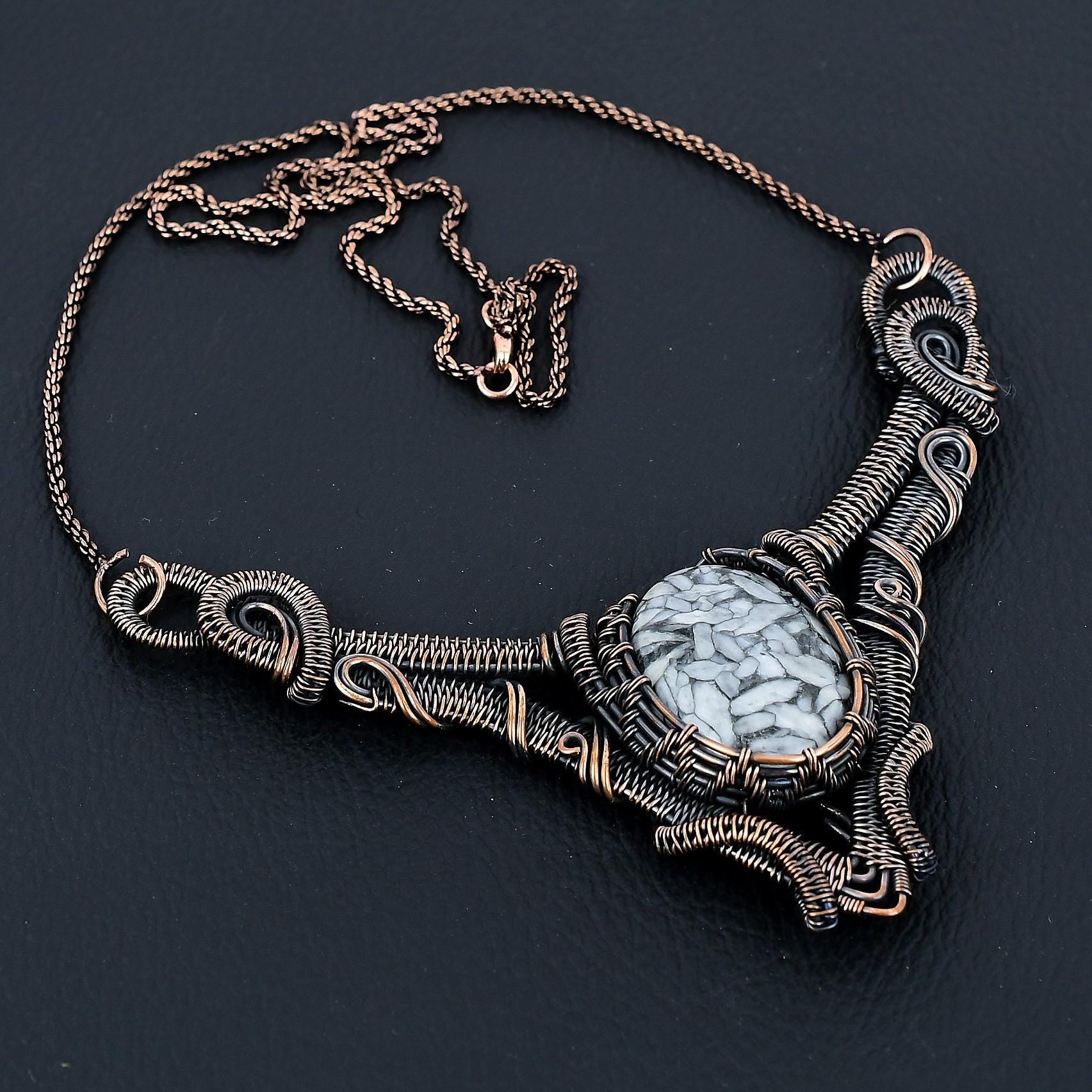 Experience the elegance and uniqueness of our handcrafted statement necklace. This eye-catching piece features intricate wirework in antique bronze, artfully intertwining to create a stunning geometric design.