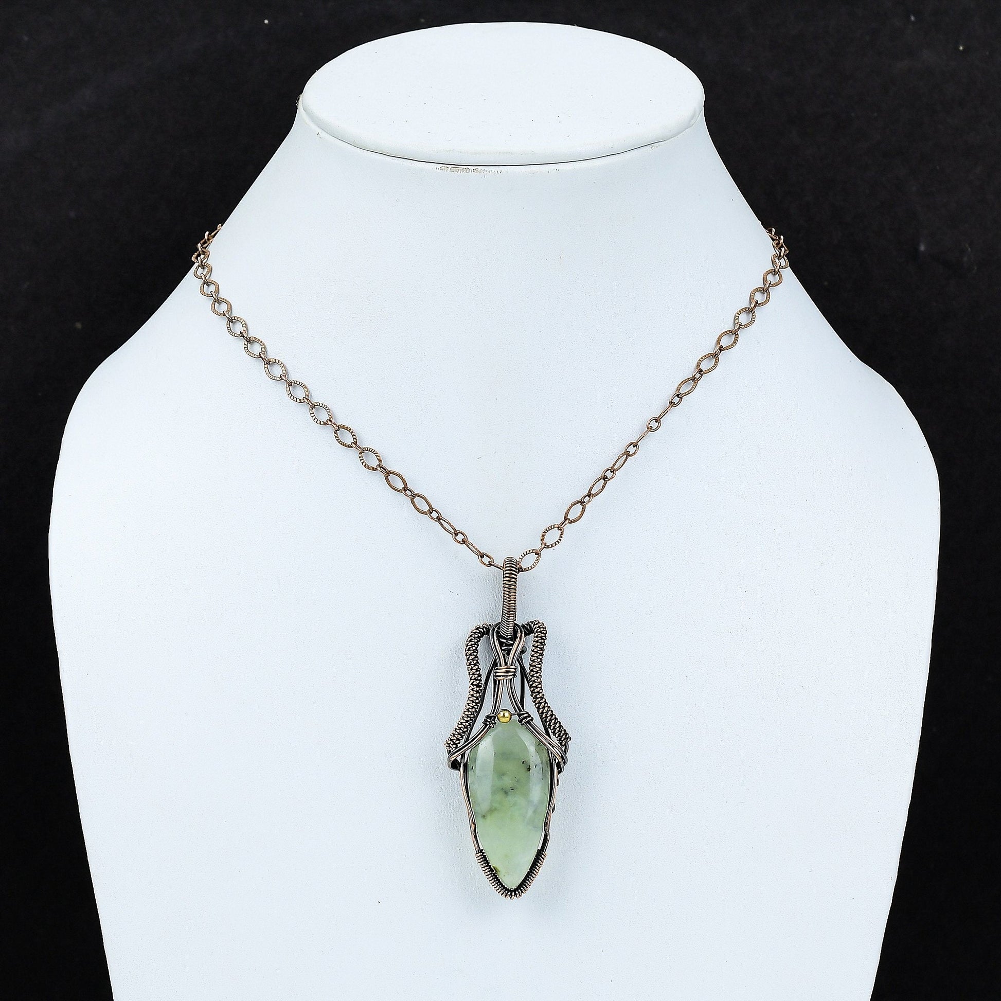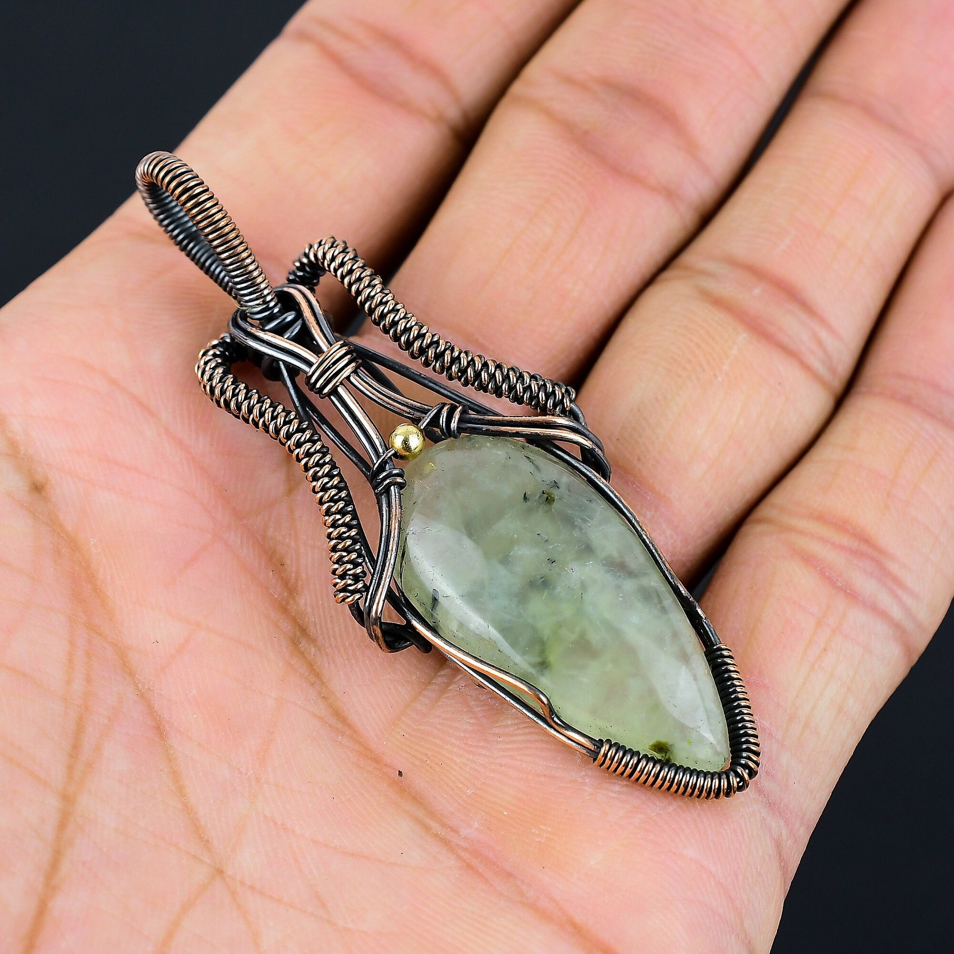 Featuring a stunning, translucent gemstone that captures light beautifully, this piece is finely wrapped in intricate copper wirework, offering a unique blend of rustic charm and modern sophistication.