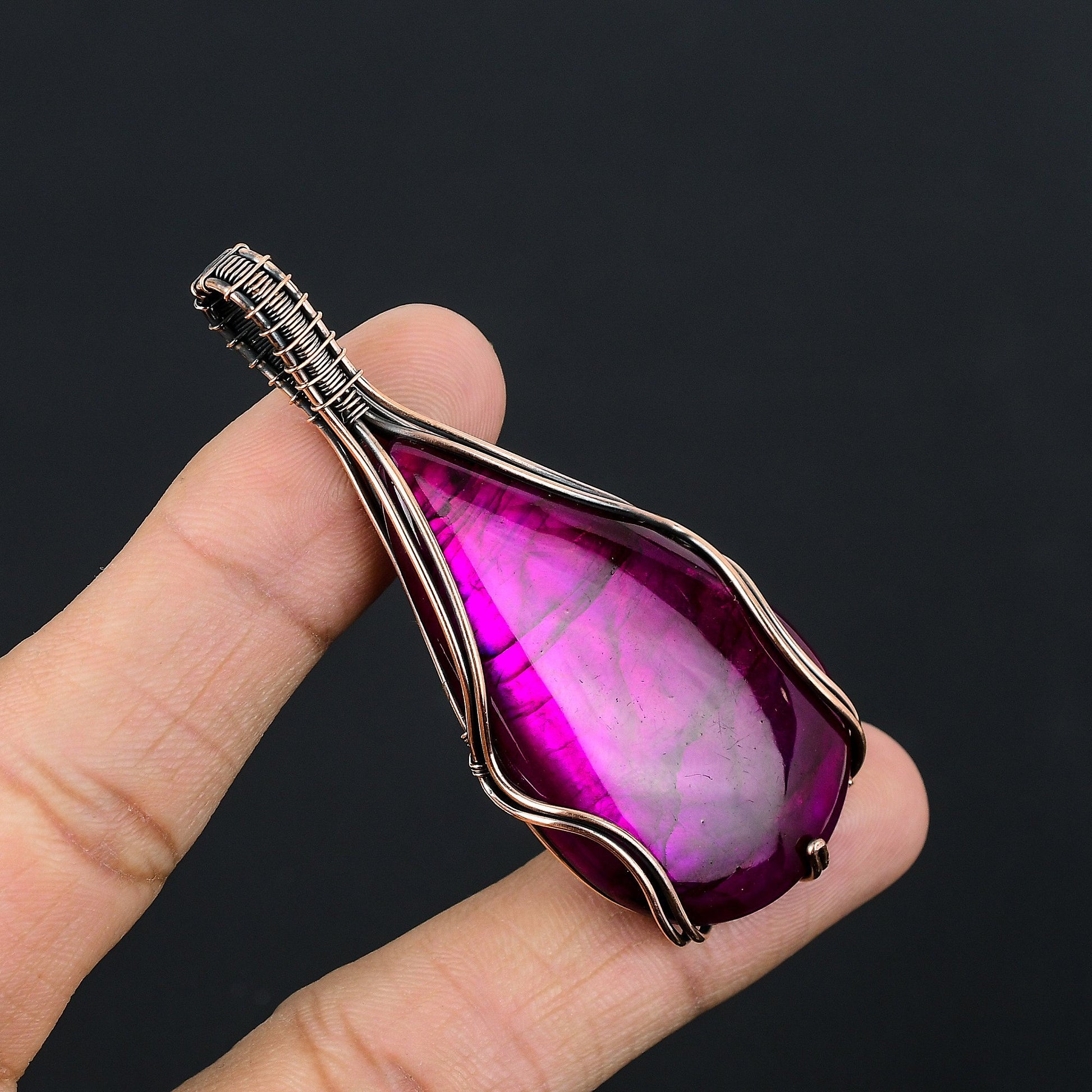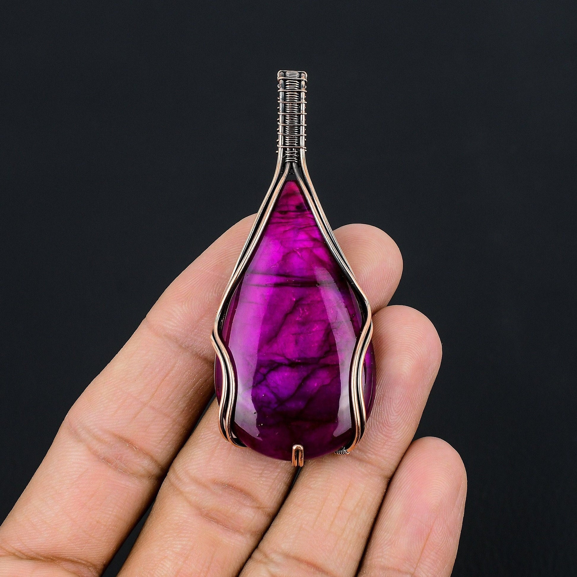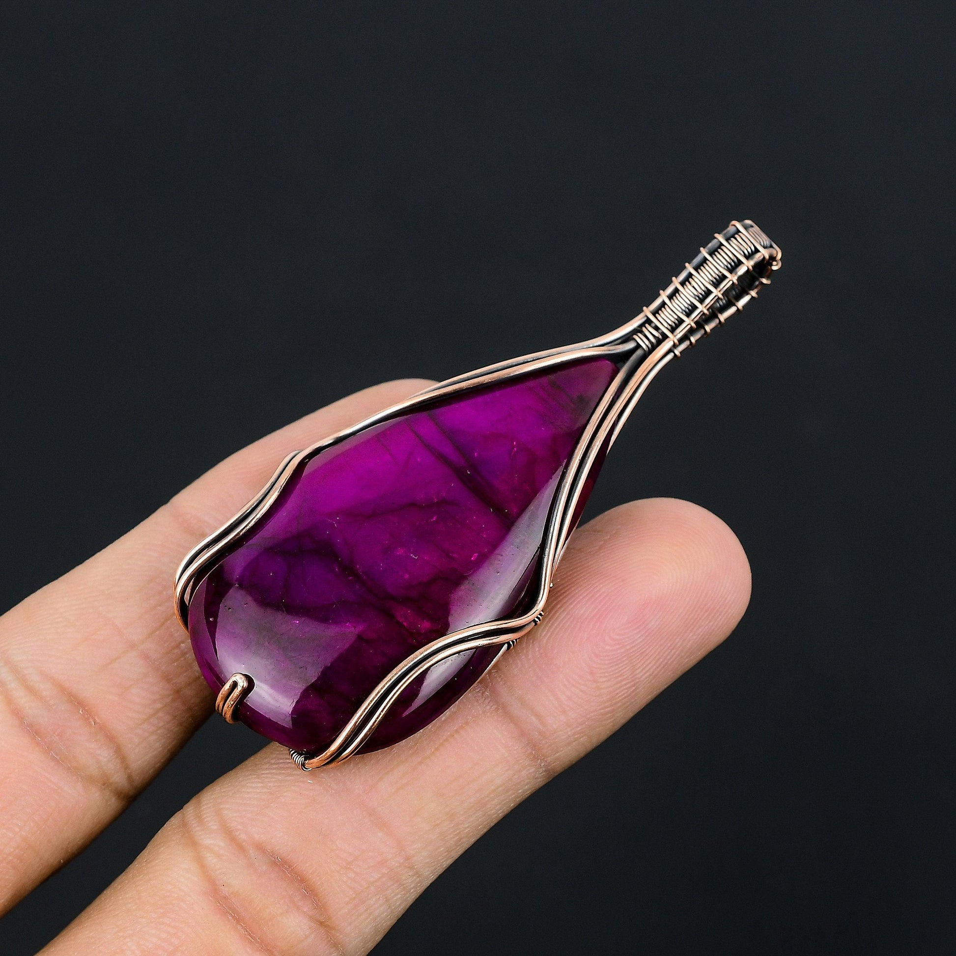 Artfully crafted with a rich, deep purple hue, this piece is a testament to timeless style. The pendant is wrapped in intricate wire detailing that adds a touch of sophistication, making it a perfect accessory for any occasion.
