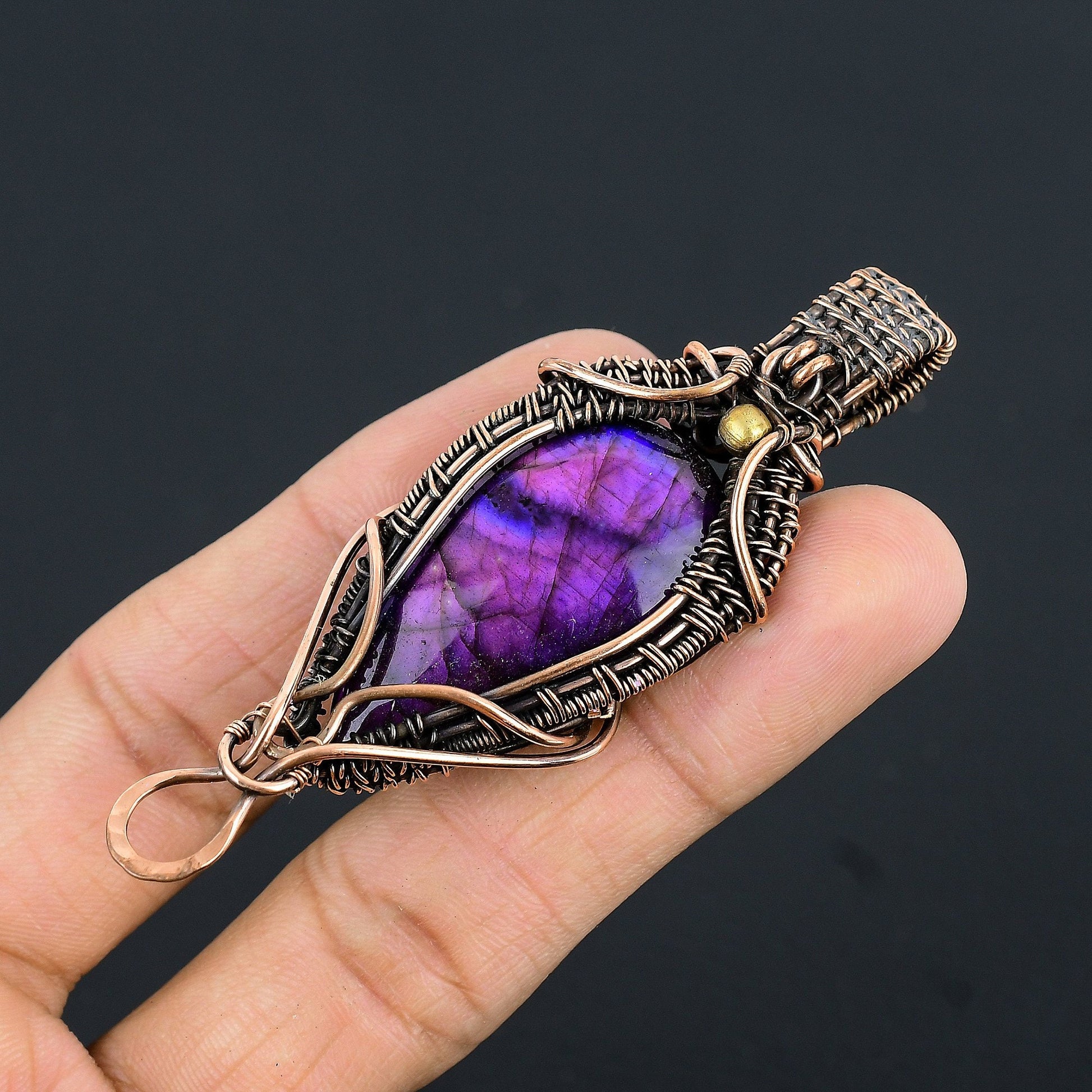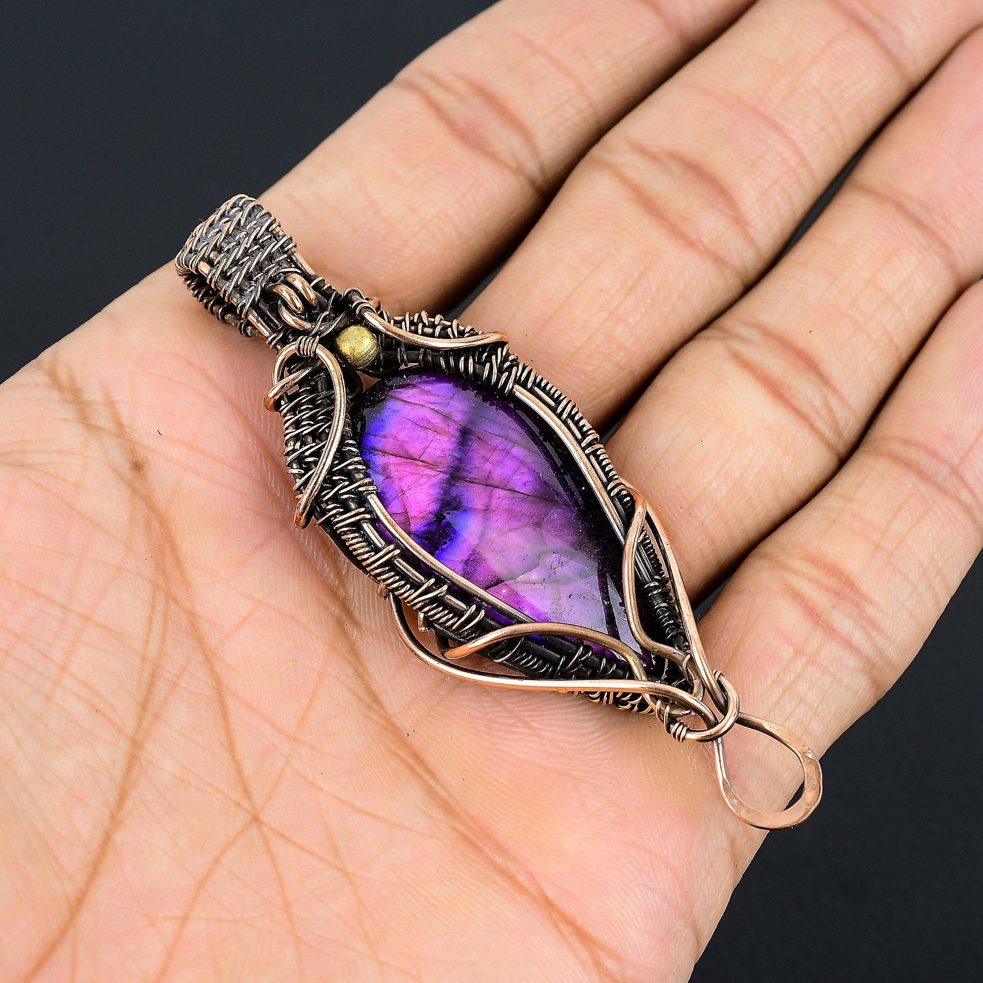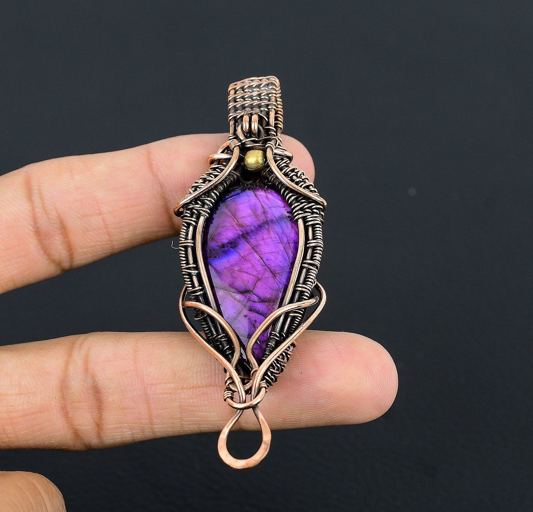 This unique piece features a beautiful violet gemstone, carefully encased in intricately woven copper wire, highlighting the natural beauty and allure of the stone.