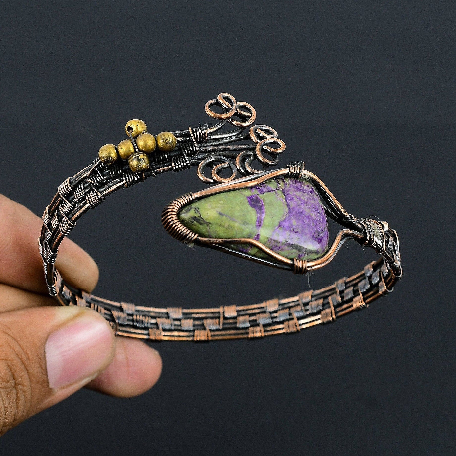 Discover the enchanting beauty of this handcrafted wire-wrapped bracelet, featuring a striking green and purple gemstone centerpiece that exudes elegance and mystique.