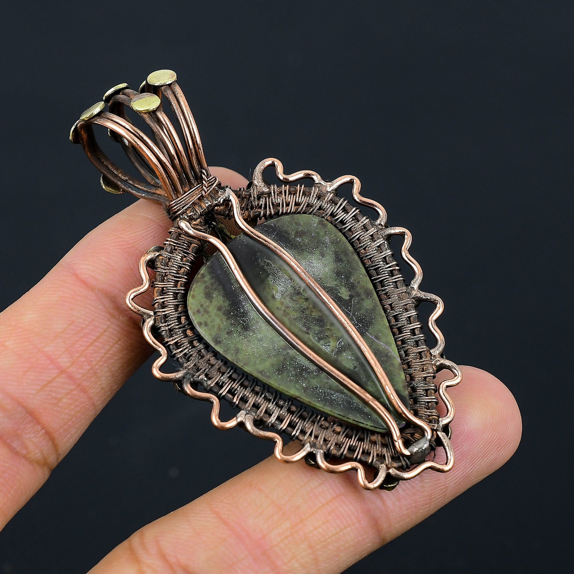 Design: Featuring a beautifully intricate wire-wrapped frame, this pendant showcases a stunning teardrop-shaped gemstone. The vibrant purple and green hues of the stone are highlighted by delicate metal accents, giving it a unique and captivating look.