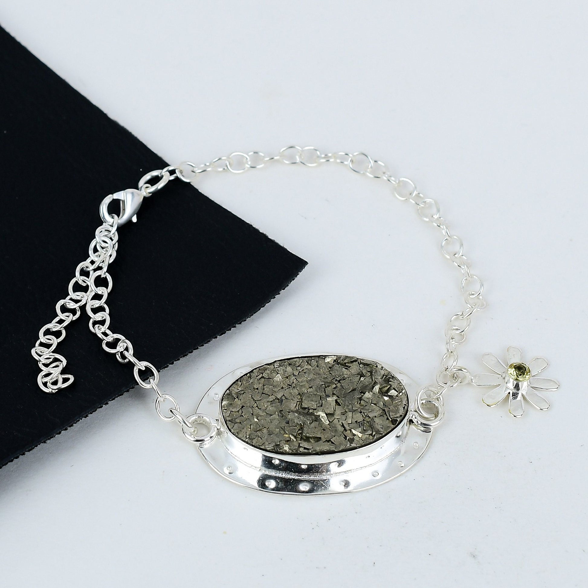 Discover the allure of our stunning pyrite and sterling silver bracelet, a perfect blend of elegance and modern design.