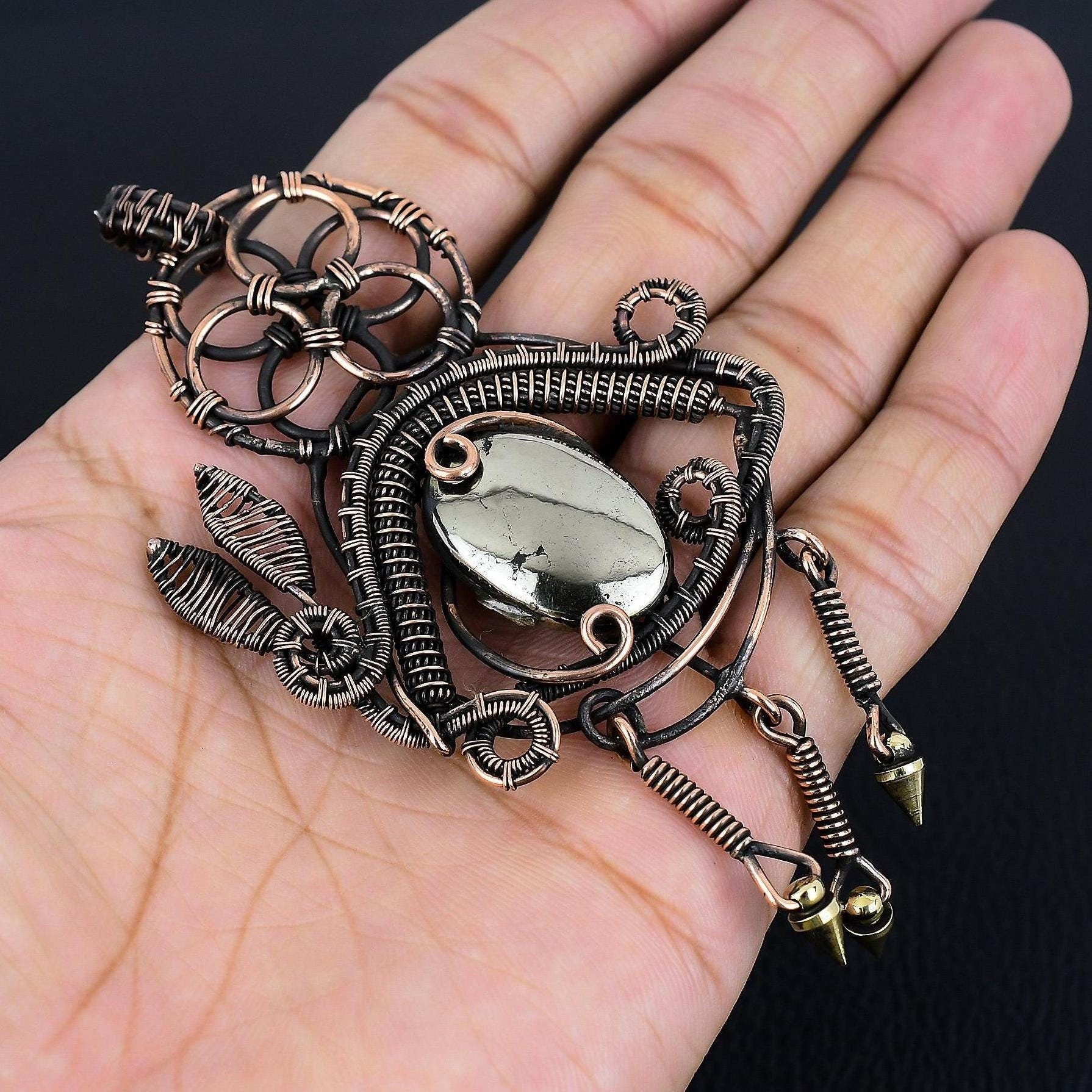 This unique piece features a striking metallic gemstone at its center, artfully encased in copper wire, creating an intricate and captivating pattern.