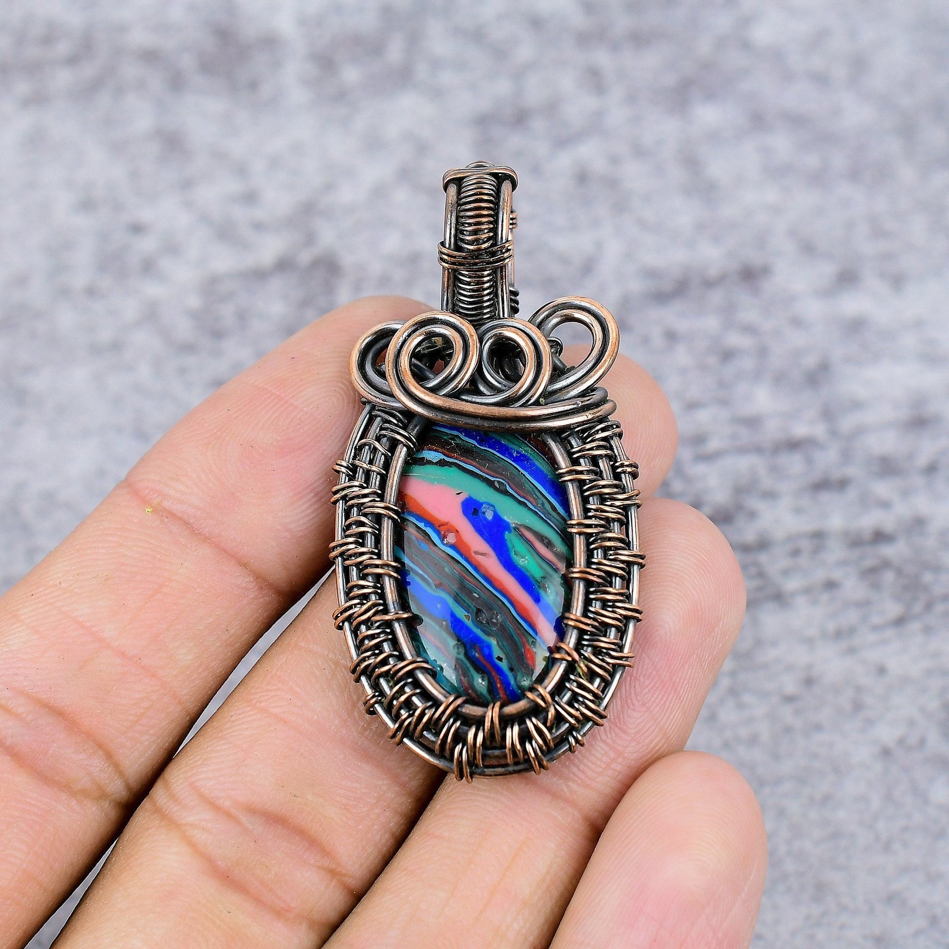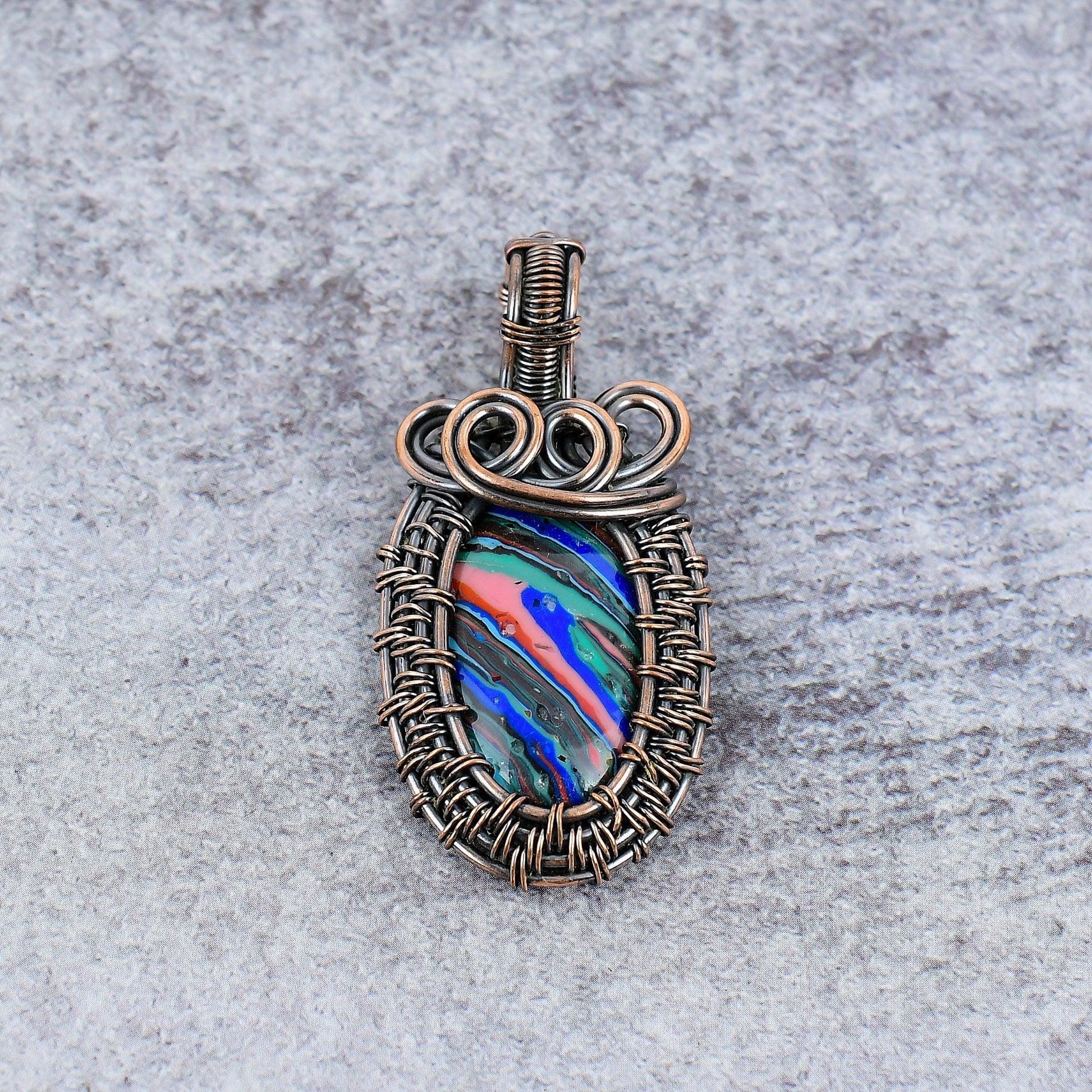 Discover the allure of timeless craftsmanship with this exquisite hand-wrapped pendant. Each delicate loop and swirl of wire is meticulously crafted to embrace the vibrant, multicolored stone at its heart, making every piece unique.
