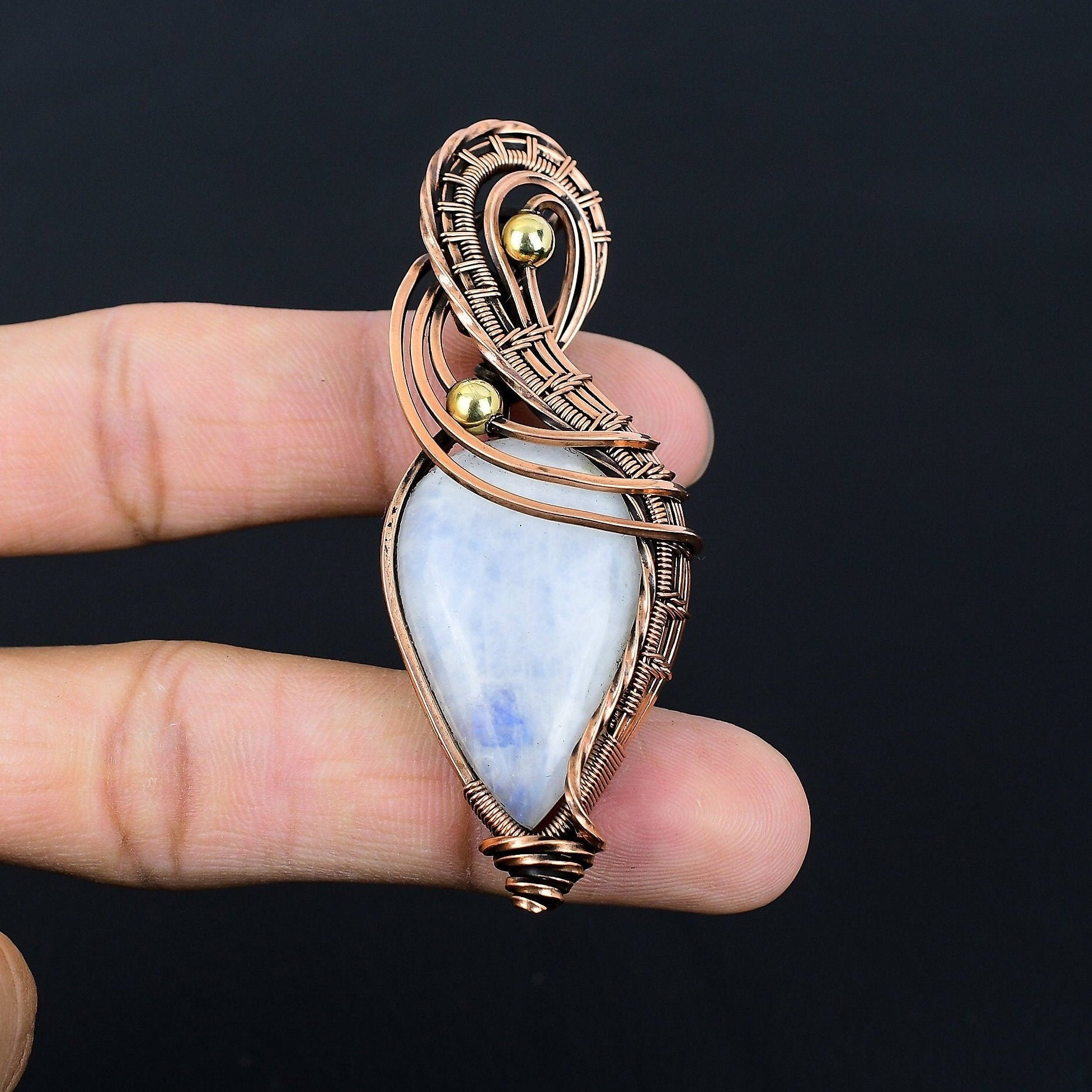 This unique piece features a stunning, pear-shaped moonstone, artfully encased in intricate copper wire swirls.