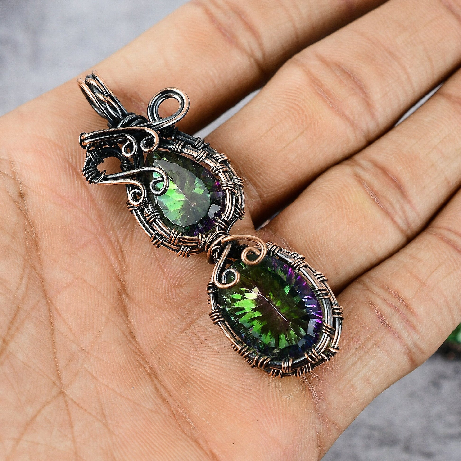 Embrace timeless elegance with this exquisite wire-wrapped pendant, featuring two captivating stones that shimmer with hues of violet and green.