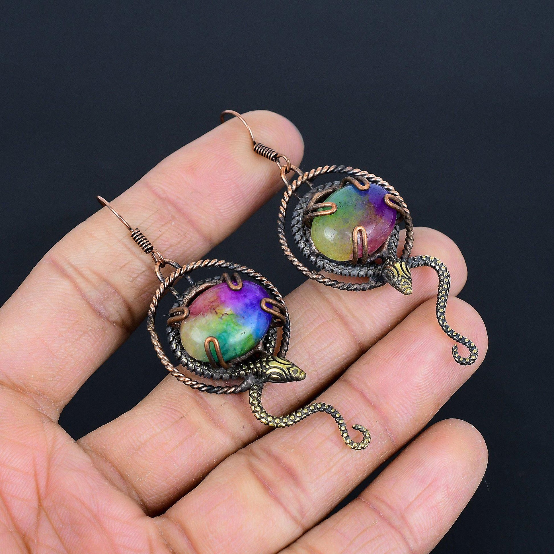 Enhance your style with these mesmerizing handcrafted earrings, featuring a vibrant rainbow-hued gemstone that encapsulates a spectrum of colors.