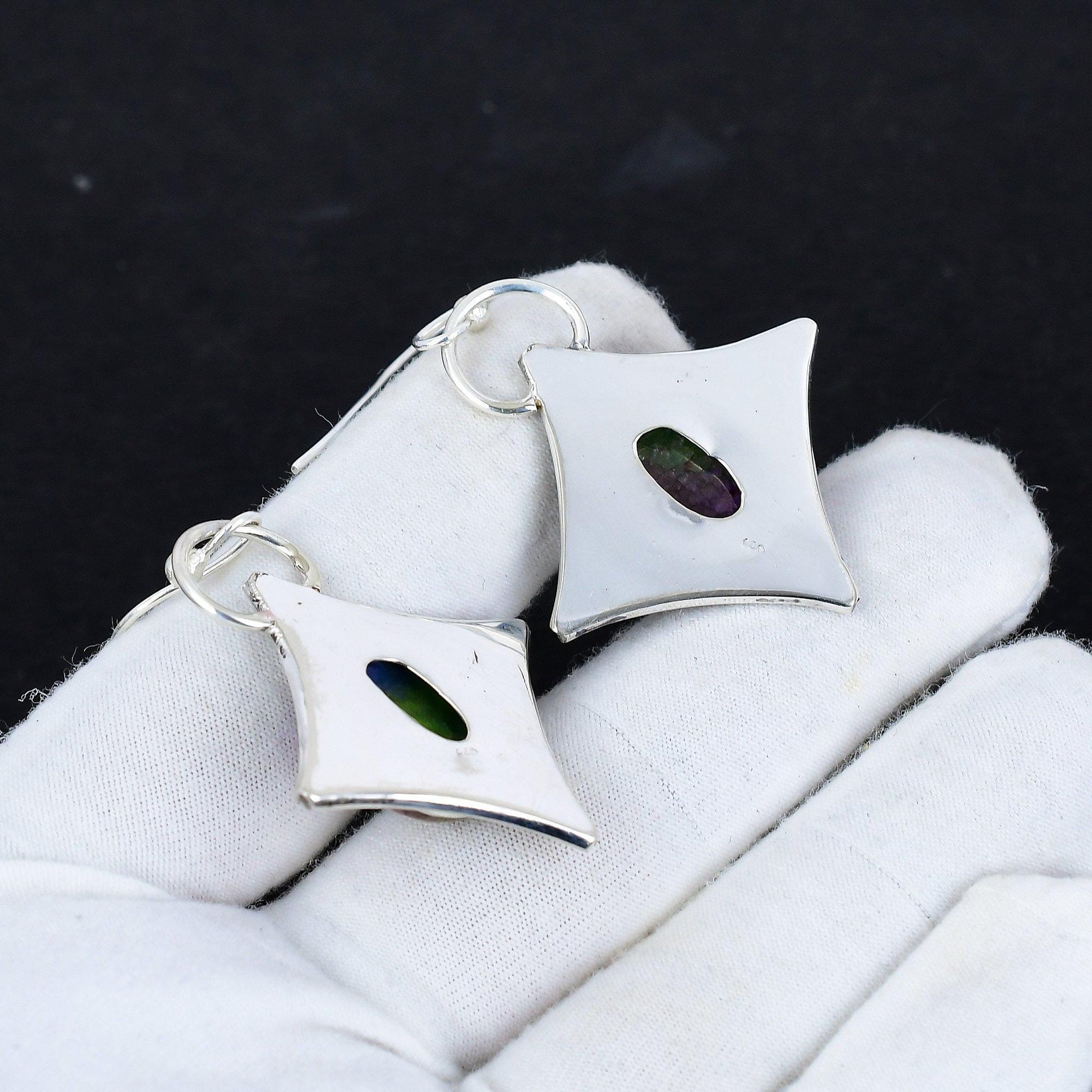 Enhance your collection with these exquisite multi-colored gemstone earrings. Perfectly set in an intricate sterling silver frame, the vibrant hues of the gemstone capture the essence of elegance and style.