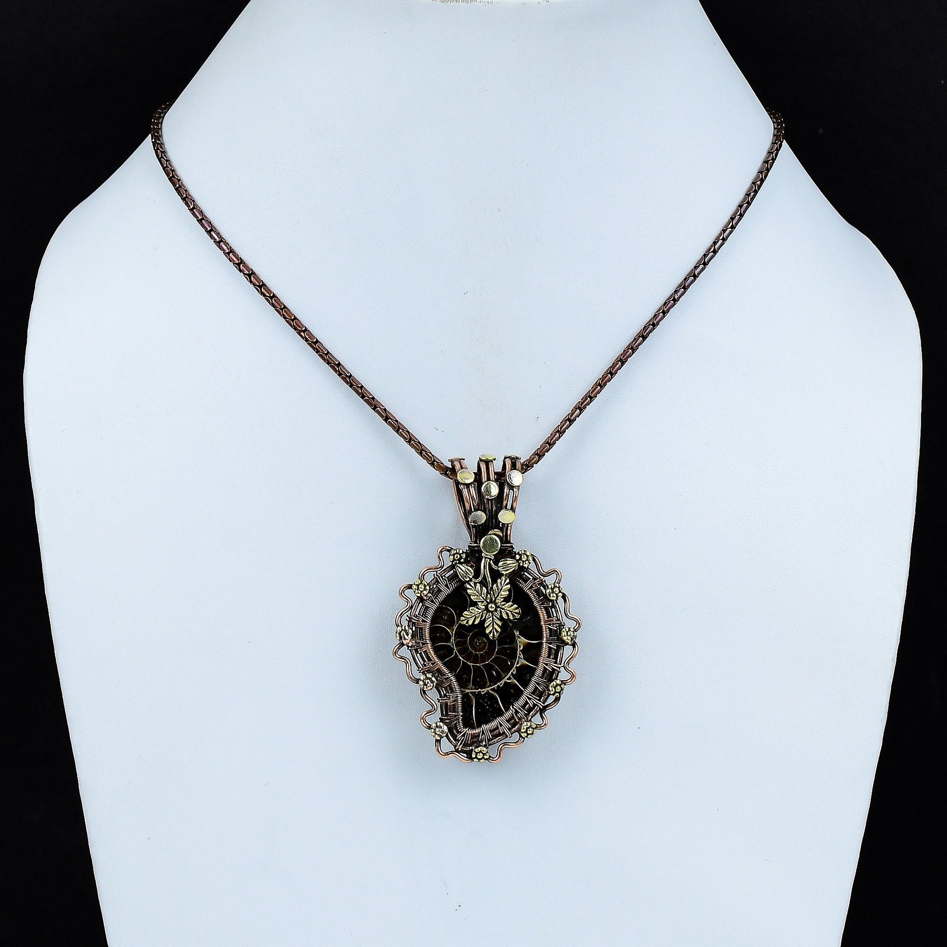 This unique piece features a stunning, naturally preserved ammonite fossil, intricately wrapped in copper and adorned with delicate leaf and floral details.