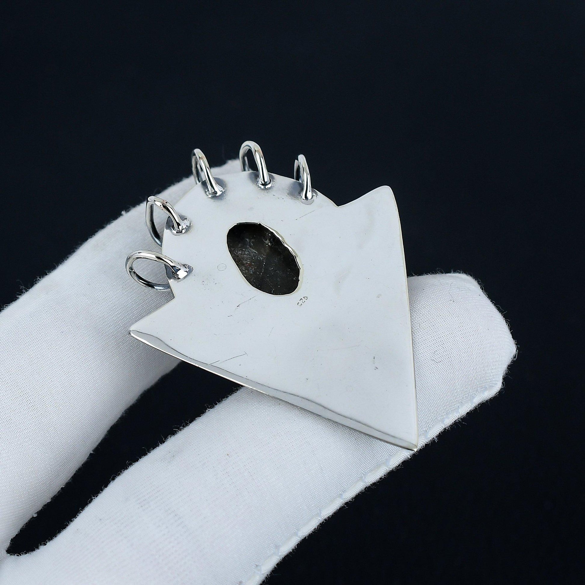 The pendant is meticulously crafted with textured silver, forming an eye-catching triangular shape. Intricately detailed loops add a dynamic touch, further accentuating the central stone.